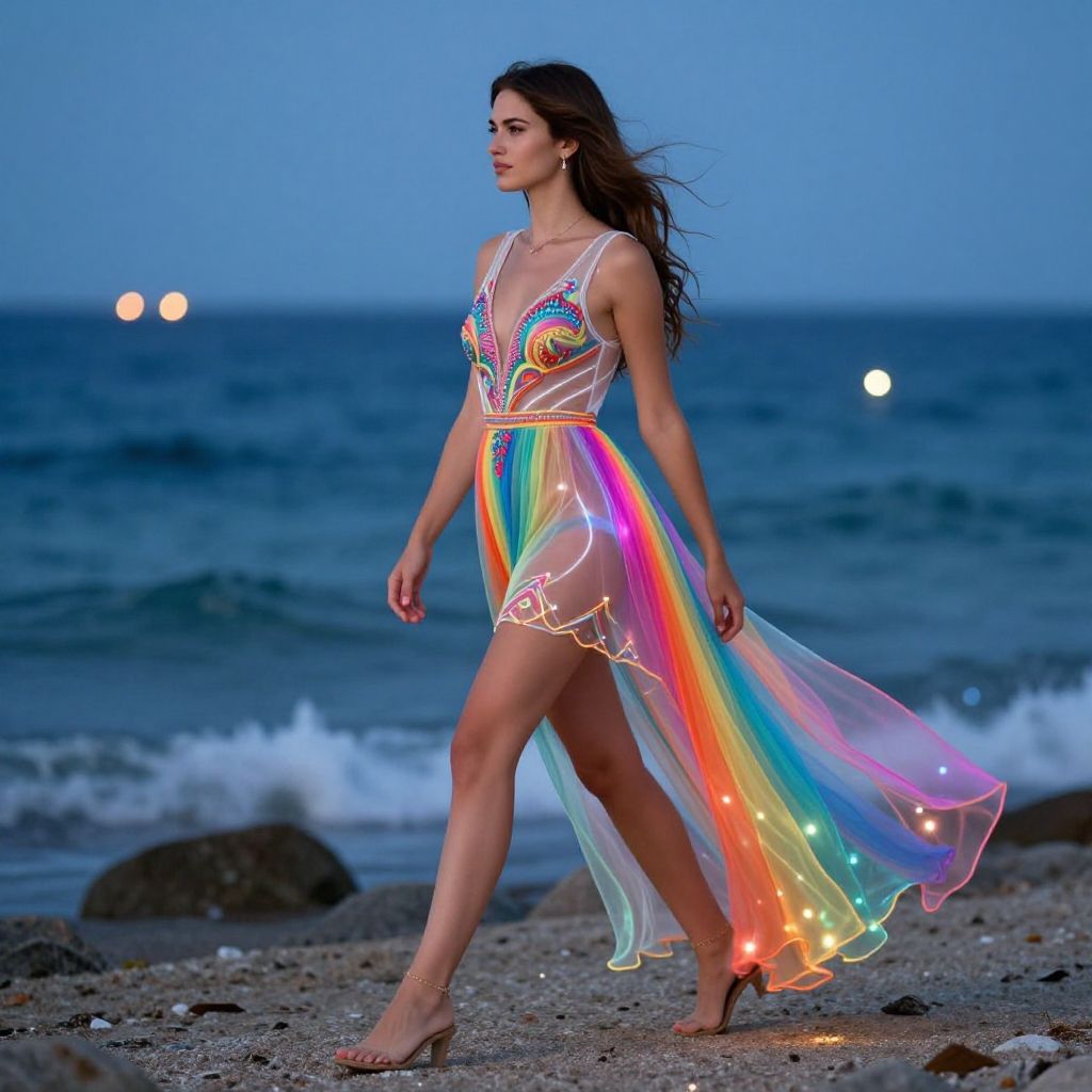 Photograph of a young woman with long brown hair walking on a rocky beach at dusk, wearing a colorful, glowing, sheer dress with rainbow lights against