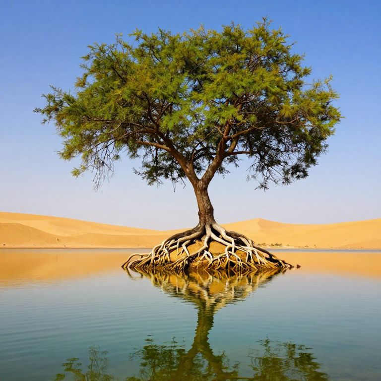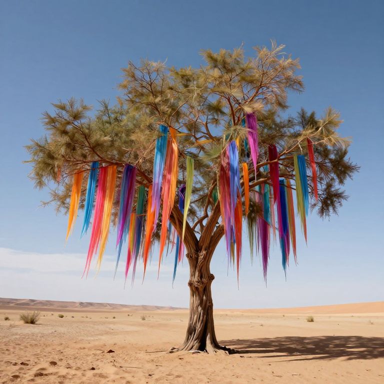 In a surreal desert landscape, a solitary tree stands as a beacon of hope, its vibrant, prismatic tendrils cascading like streams of untapped potential, whispering stories of resilience and the enduring spirit of life.