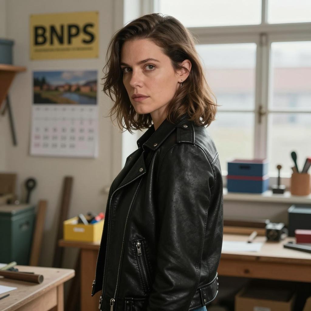 Woman with dark hair in teal turtleneck sweater, wearing brown gloves, holding bloody knife, standing in dimly lit storage room. Metal trash can, green metal box, wooden crates, and tarp in background. She looks focused, arm extended. One person. Realistic photograph.