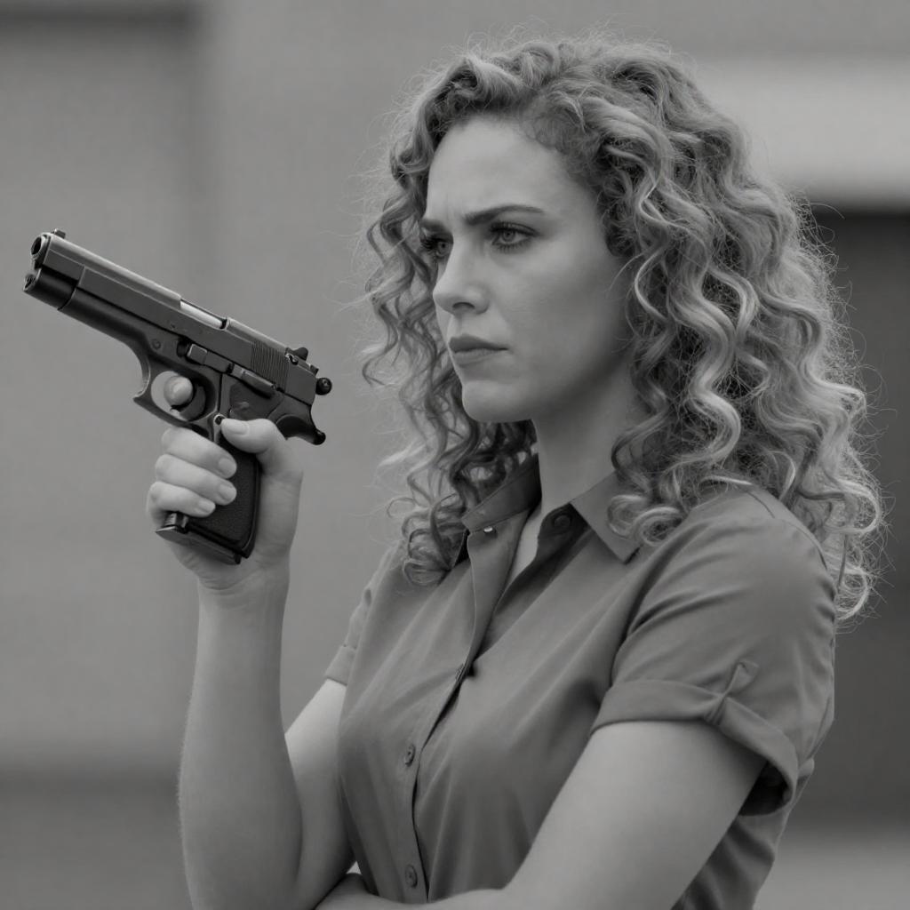 Photograph of a woman with short dark hair, wide blue eyes, and a concerned expression, wearing a white jacket over a white shirt, holding a silver gun in her right hand. Brown ured wall background. Upper body shot.