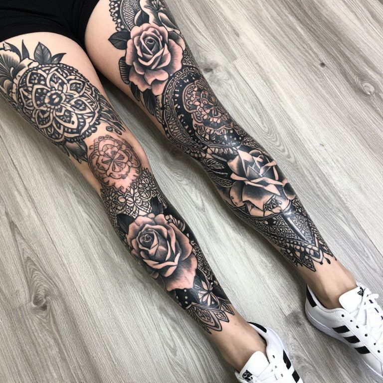 Photograph of a person's heavily tattooed legs lying on a wooden floor. The tattoos feature intricate black and grey roses, mandalas, and lace patterns. The person is wearing white sneakers with black stripes. The tattoos have a realistic and detailed style, covering most of the legs. The floor has a light grey wood grain texture. The image is taken from above, focusing on the legs.