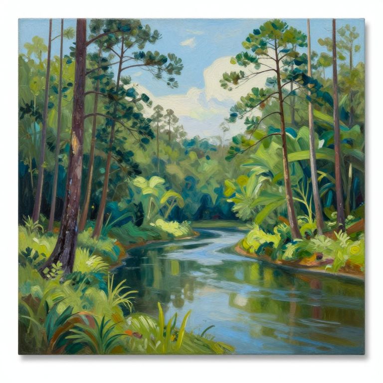Vibrant oil painting titled \"Suwannee River Palms,\" measuring 24 inches by 20 inches, depicts a serene forest scene with tall pine trees lining a tranquil riverbank, rendered in rich greens and blues against a soft sky backdrop.