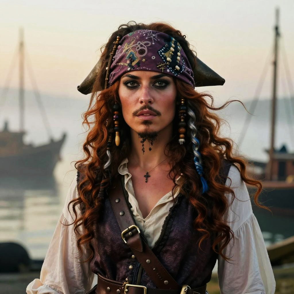 Portrait of pirate woman hair cascading in loose curls, deep chestnut color mixed with streaks of silver and blue, wind blowing gently, wearing an elaborate bandana and vintage pirate attire, set against a misty harbor at dawn, painterly texture
