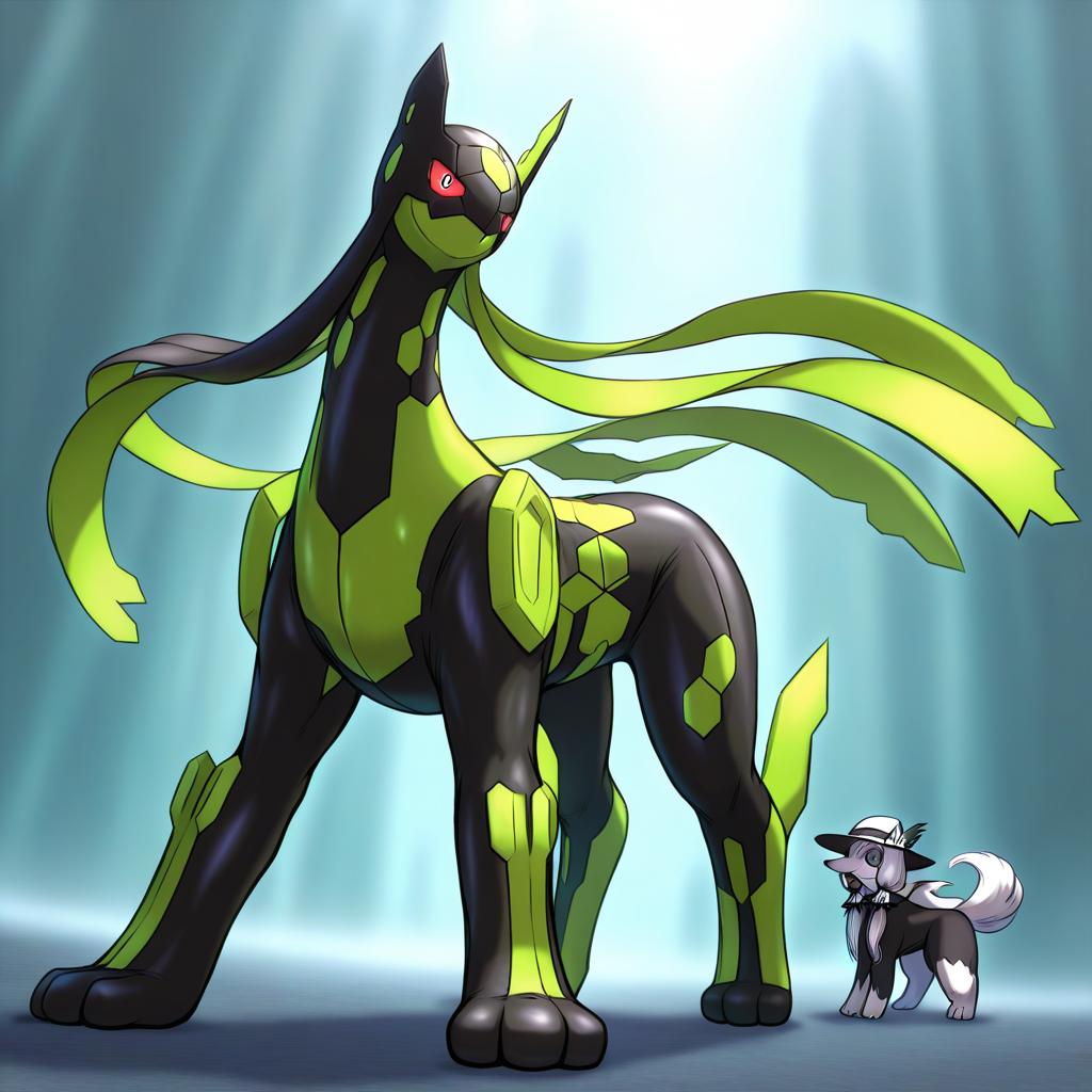 Digital artwork of two Pokémon: a large, black and neon yellow, sleek, quadrupedal Pokémon with a mask-like face, red eyes, and flowing ribbon-like extensions stands confidently in the foreground. To the right, a smaller, black and white, wolf-like Pokémon with a white tuft on its head stands looking up. The background features a bright, glowing, blue light with beams of white light radiating from above, highlighting the figures. The large Pokémon's design is reminiscent of a sleek, futuristic creature, while the smaller one has a more traditional, canine appearance. The overall style is vibrant and dynamic.