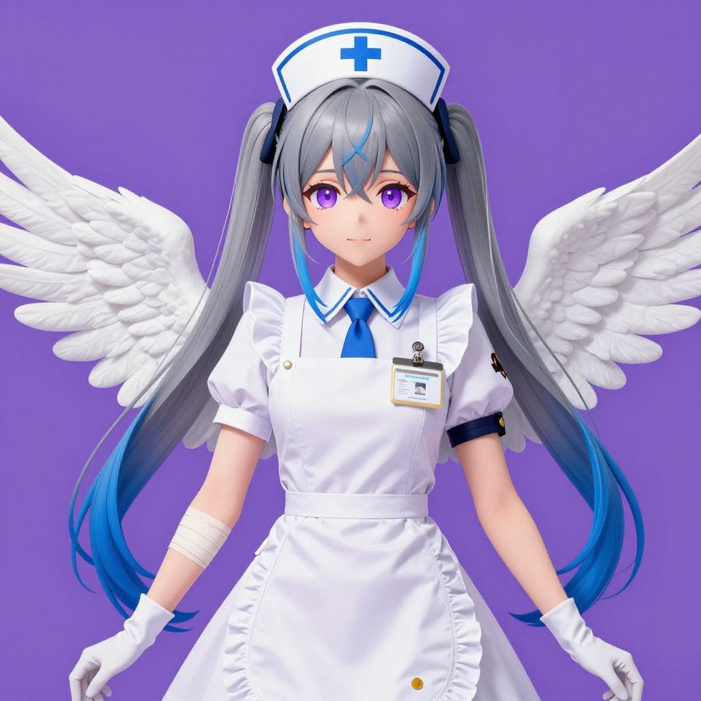 Digital anime-style illustration of a young female nurse with long, grey and blue gradient hair in twin tails, wearing a white nurse's cap with a blue cross. She has purple eyes and white angel wings. She is dressed in a white nurse's uniform with blue accents, including a necktie, a name tag on her chest, and white gloves. Her arms are slightly raised, and she has a bandage on her right arm. The background is a solid purple. The image has a vibrant, colorful aesthetic with sharp, clean lines typical of anime art.