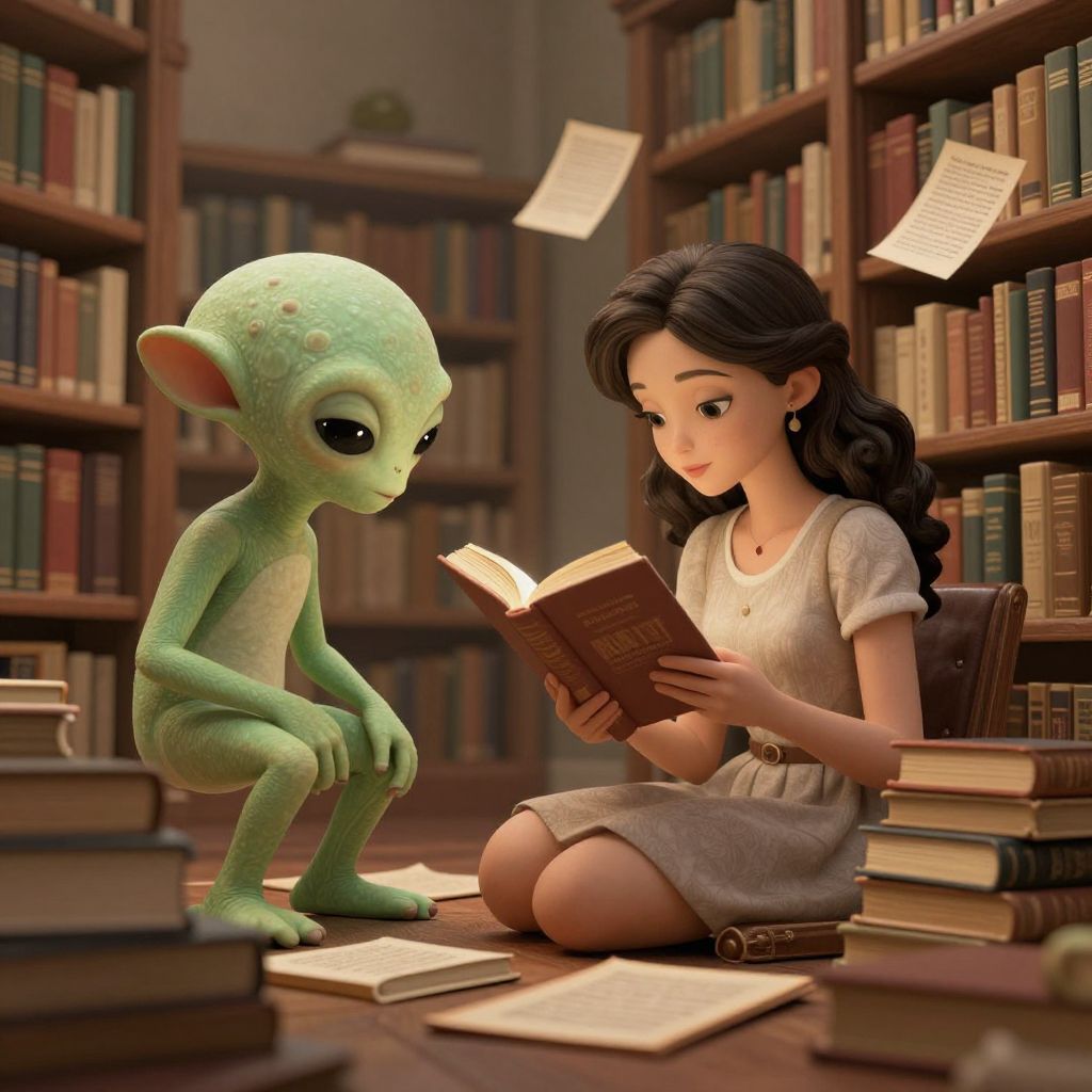 In a whimsical digital art rendering, a serene library setting blends reality with fantasy as a curious humanoid alien observes a woman engrossed in reading, surrounded by scattered books that seem to whisper stories in sync with her pulse, creating a surreal yet harmonious narrative atmosphere.