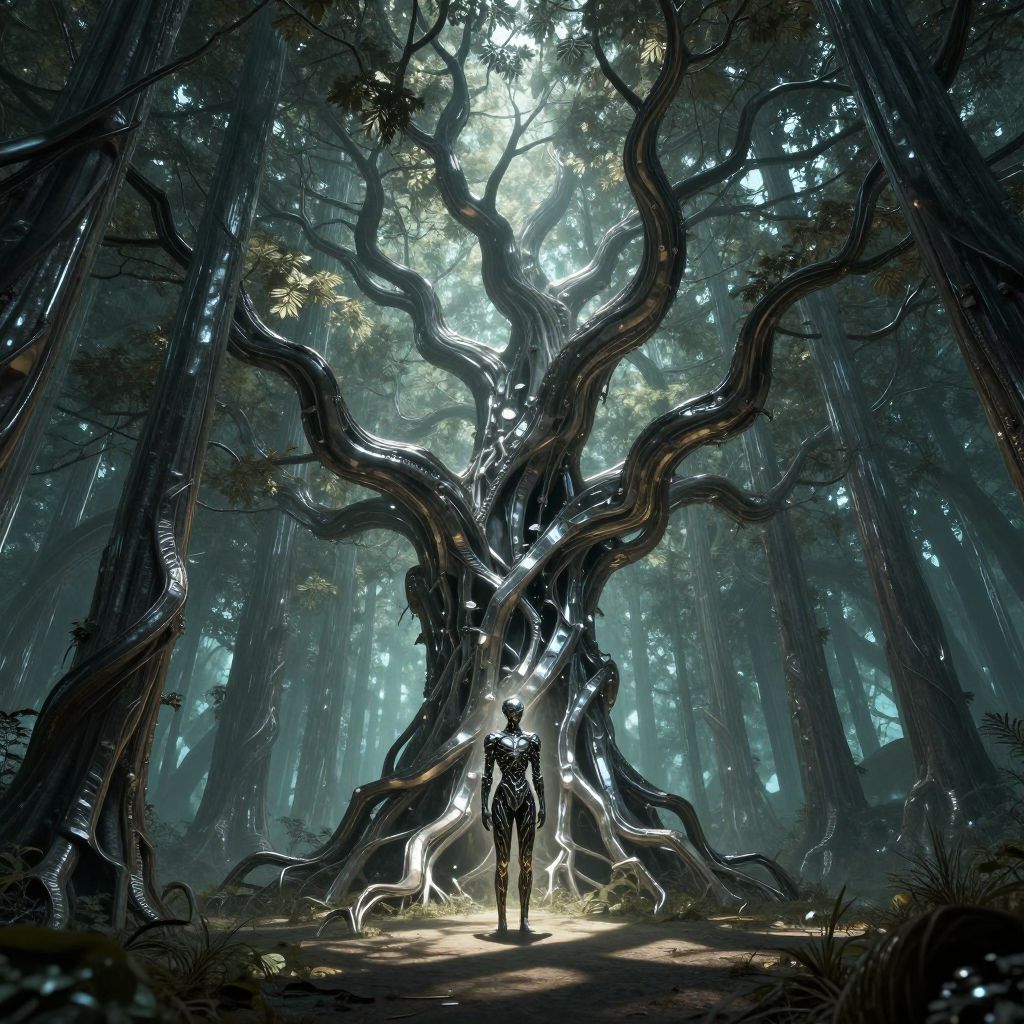 Craft an image portraying a surreal landscape where a colossal, twisted tree stretches towards the heavens, its gnarled branches adorned with gleaming metallic foliage reminiscent of ancient armor. A solitary figure emerges from this living metal forest, their human form seamlessly intertwining with the tree's skeletal structure, encapsulating the essence of a mysterious union between man and nature. The scene is bathed in soft bioluminescent light, casting elongated shadows across the forest floor, creating an atmosphere that is both captivating and unsettling as viewers are drawn into this hauntingly beautiful realm where life and machinery blur together.