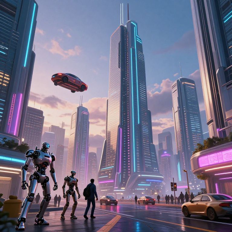 Fantascienza scene depicting a futuristic cityscape with towering neon skyscrapers and flying cars under a twilight sky, intricate robotic inhabitants walking the streets, a blend of advanced technology and vibrant urban life, cinematic lighting, hyper-detailed style.