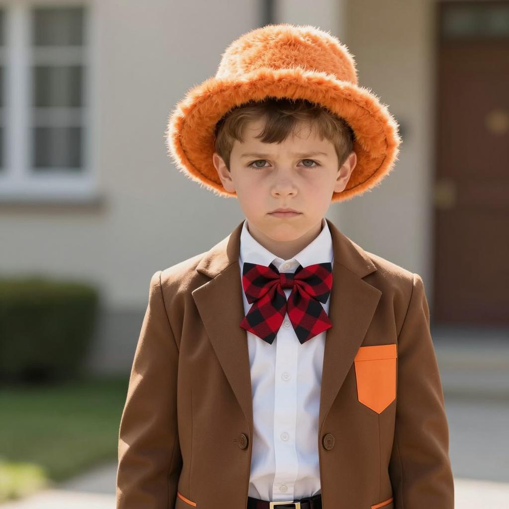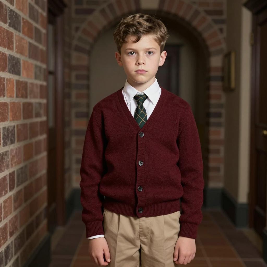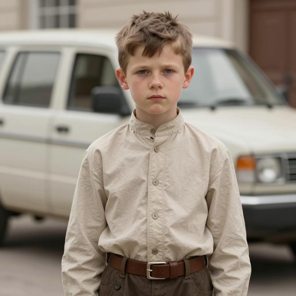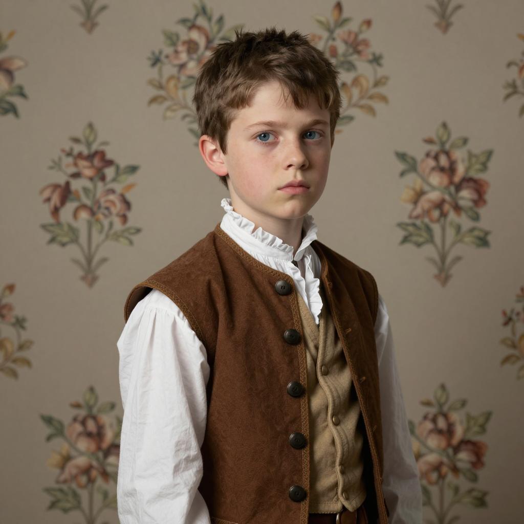 Portrait of a young boy with light skin and brown hair wearing an early 1900s style white chef hat, white buttoned shirt, and brown suspenders. He stands indoors with a serious expression, with a softly blurred background featuring a green door and a red cross sign. Natural lighting emphasizes soft shadows on his face in a medium shot, showcasing a historical costume look.