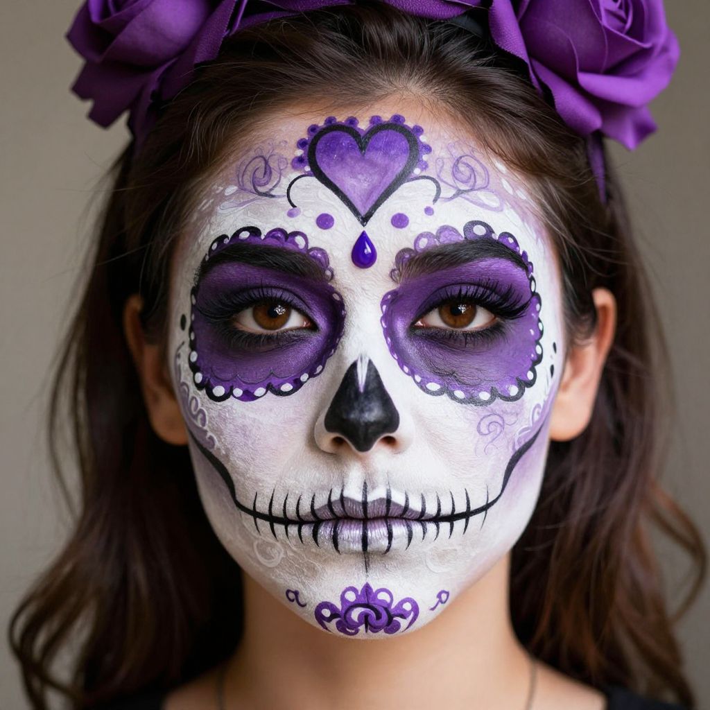 Woman showcasing vibrant Day of the Dead-inspired face paint featuring intricate purple and black designs, including a heart symbol above her forehead and detailed skeletal patterns around her eyes and mouth.