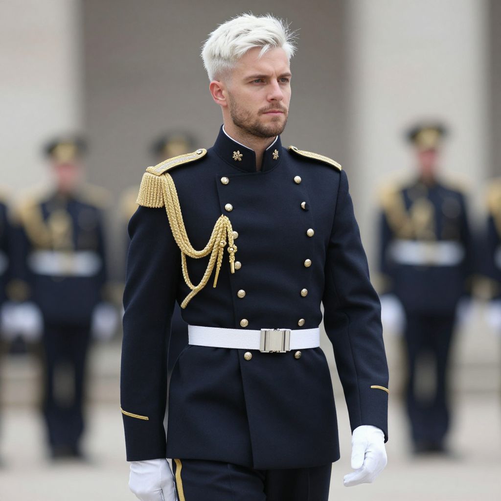 United nation costume, 1boy, male focus, solo, epaulettes, gloves, uniform, military uniform, blurry background, military, blurry, white hair, sash, arm behind back, white gloves, facial hair