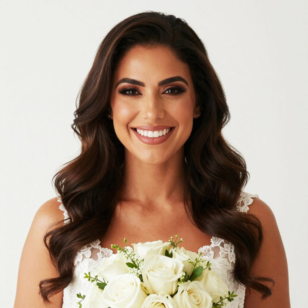 Portrait of a smiling woman with long, wavy dark brown hair and olive skin tone. She is wearing a white lace wedding dress with a deep V-neckline and holding a bouquet of white roses. The woman features bright white teeth, dark eyebrows, and small, subtle earrings. Background is plain white, highlighting the bride as the focal point.