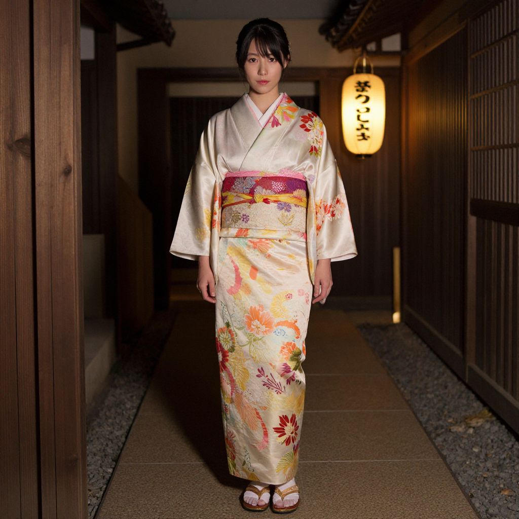 Photograph of a young Japanese woman standing in a traditional wooden corridor at night. She is wearing a shimmering, cream-colored kimono adorned with vibrant red and orange floral patterns. A wide, maroon obi belt with intricate designs cinches her waist. Her short, black hair is neatly styled. She stands on a stone pathway flanked by wooden walls and a lantern with Japanese characters hanging in the background, casting a warm glow. She wears white sandals with a slight heel. The corridor is dimly lit, with shadows enhancing the traditional, rustic atmosphere.