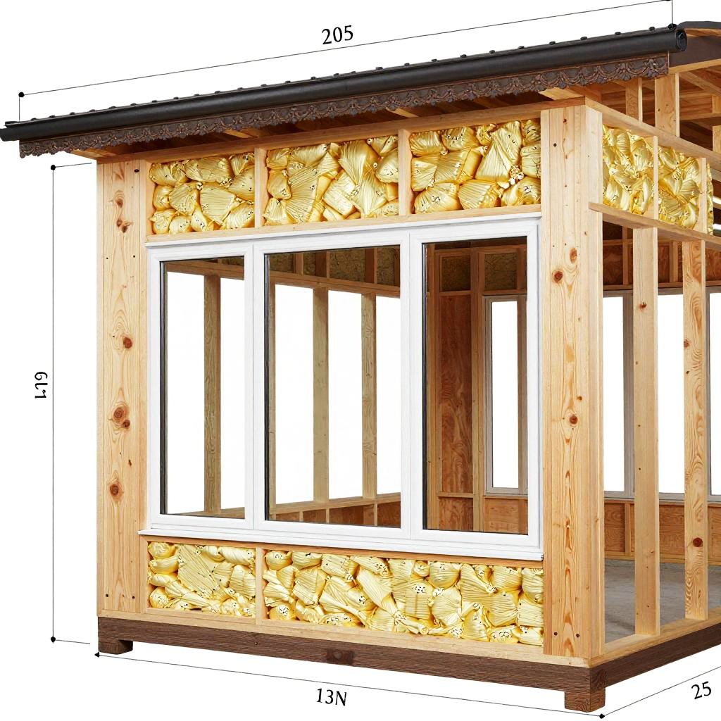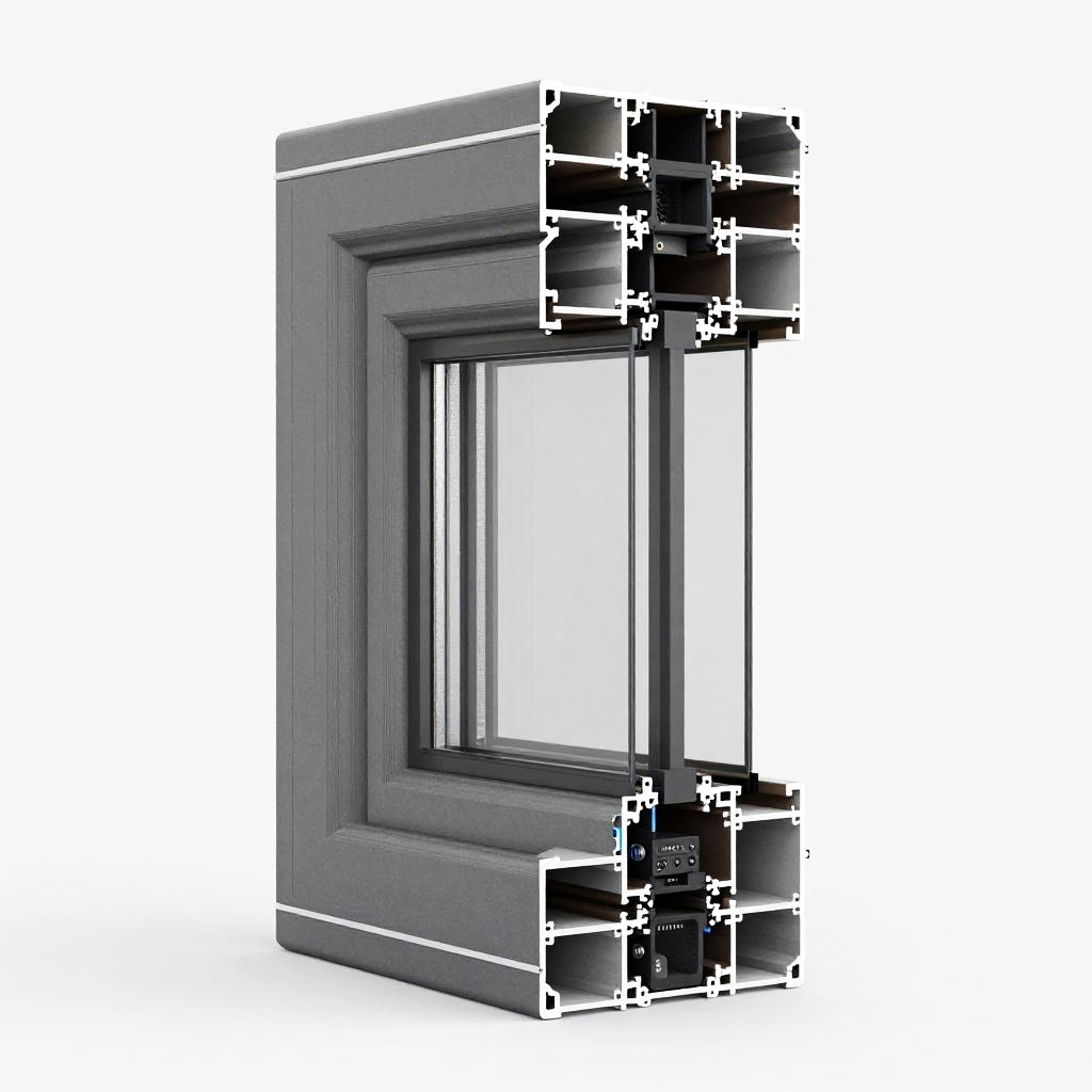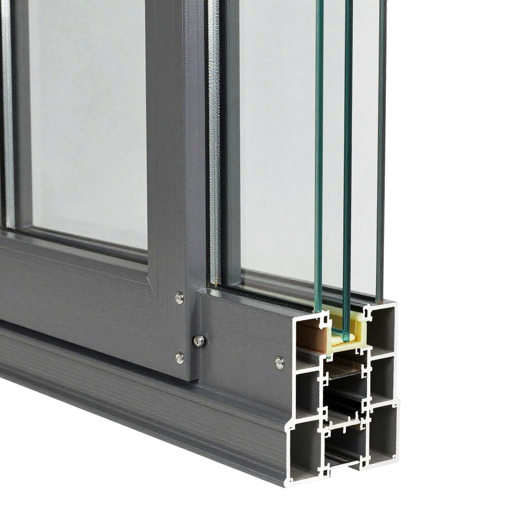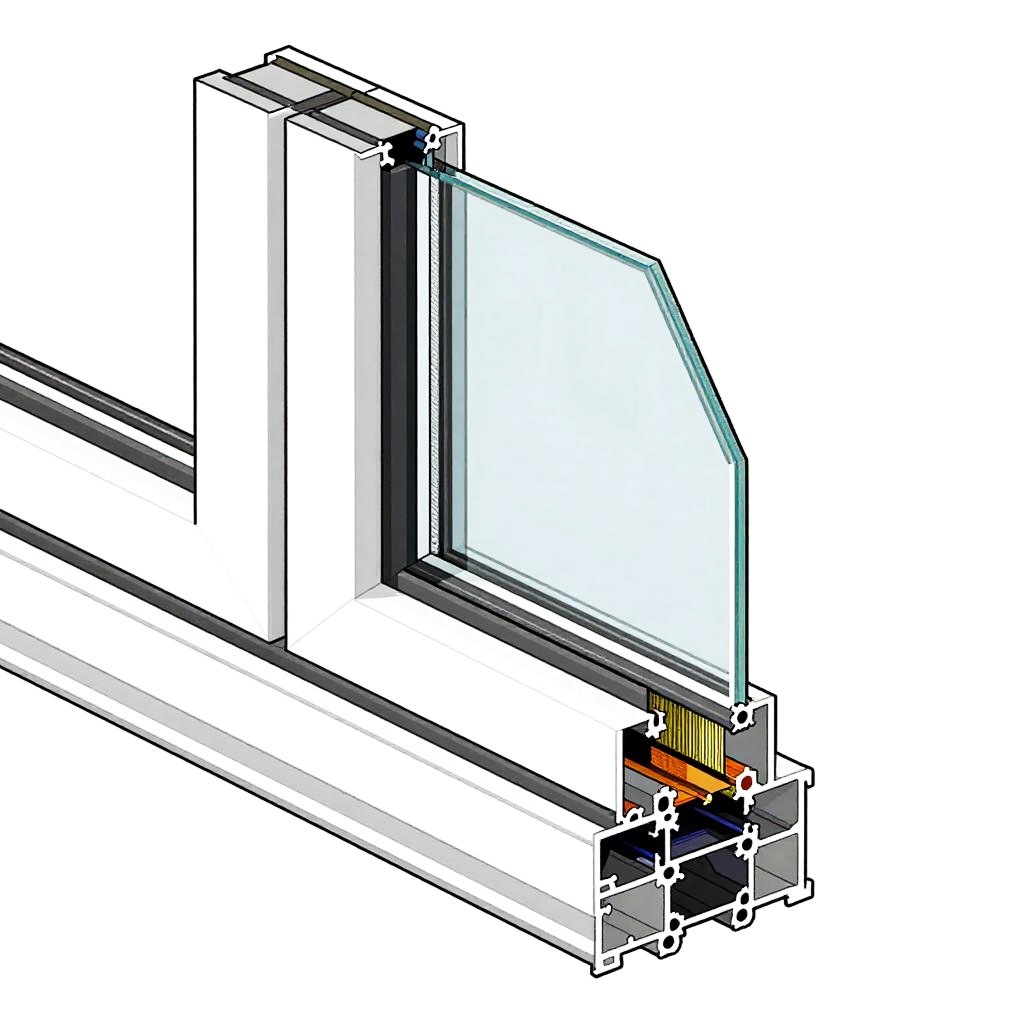 Close-up of window construction details with steel frame, thermal break, multi-layer glass panes, silicone seals, and mounting hardware, technical drawing aesthetic