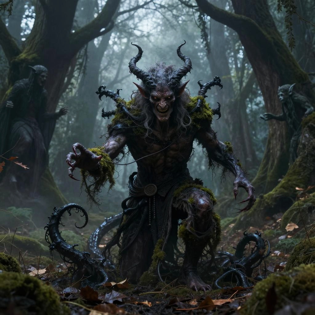 Evil druid art of a twisted nature mage with shadowy tendrils emerging from the earth, cloaked in moss and decayed leaves, summoning dark forest spirits in a haunting, mist-filled woodland at twilight, rich textures and atmospheric fantasy style