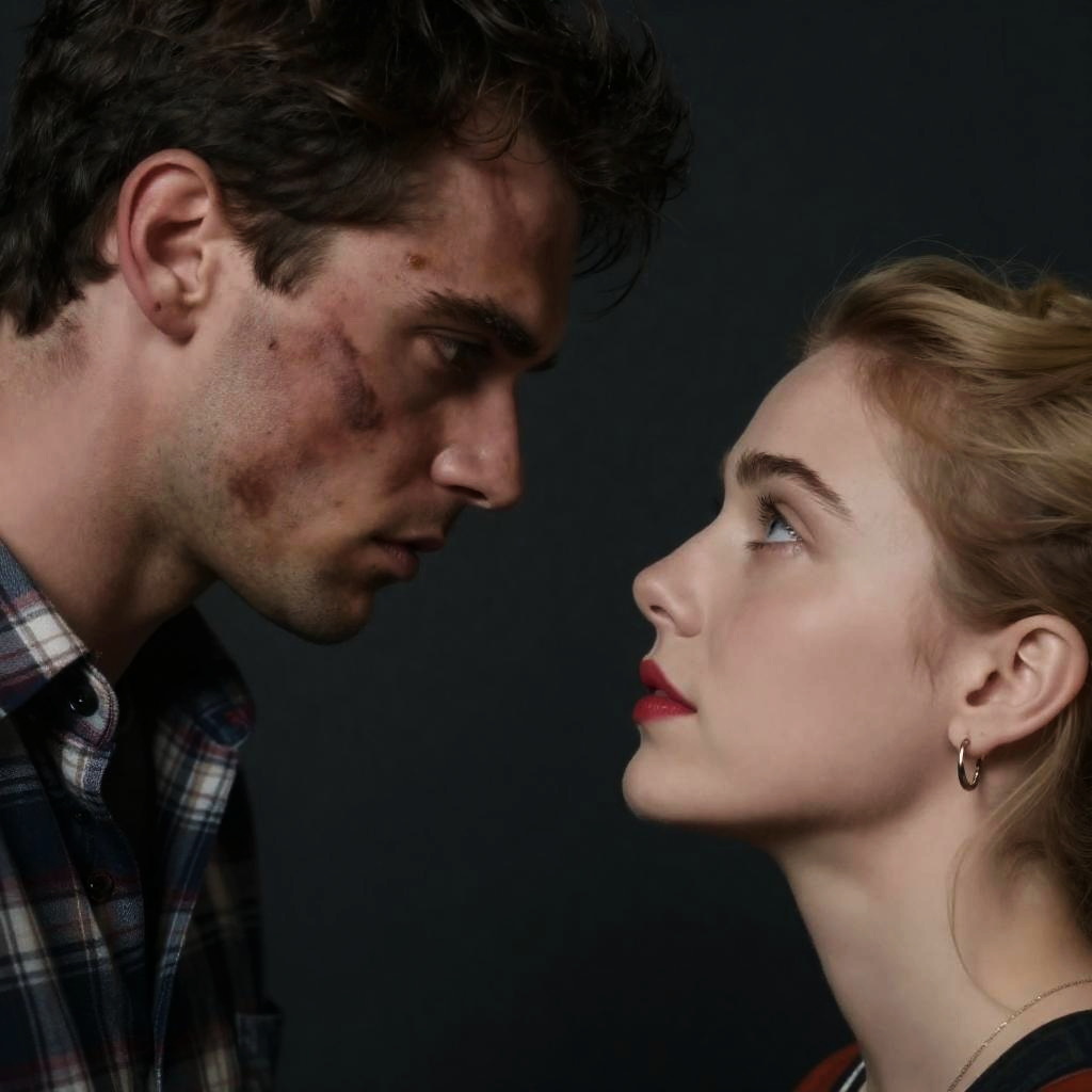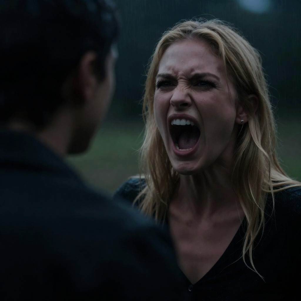 A photograph of a man holding a knife to a woman's throat in a forest. Man has beard, dirty brown shirt, and dirty hands. Woman has blonde hair, dirt on face, and wears a brown tank top. Man's hand grips her neck. Knife is close to her mouth. Background shows blurred trees. Woman's eyes are closed. Man's face is partially visible.