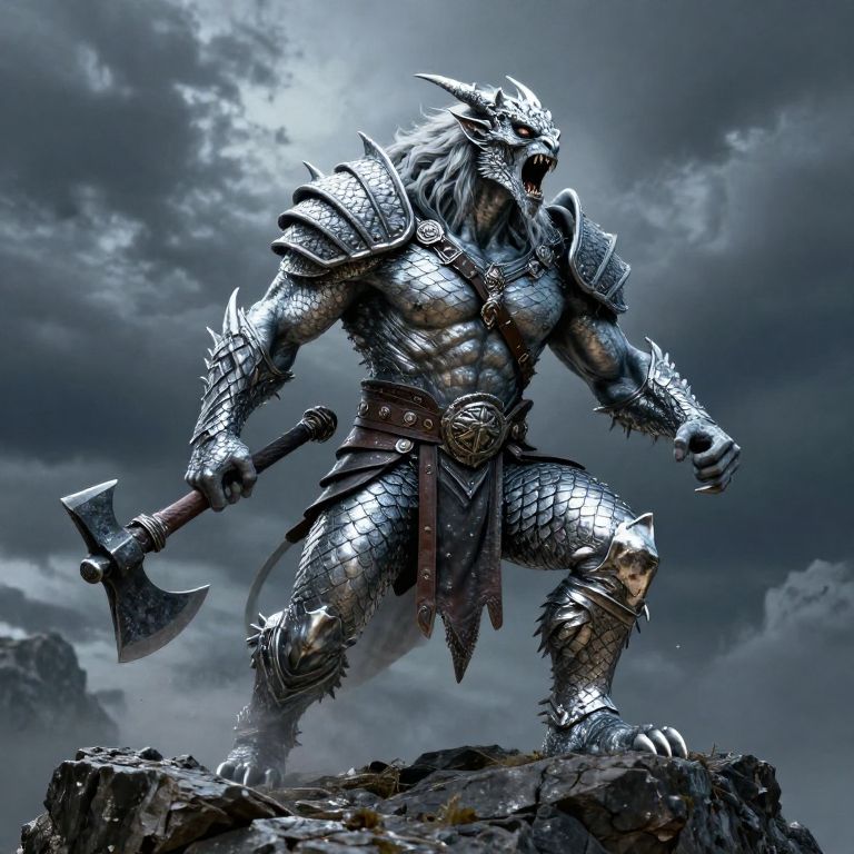 Silver dragonborn barbarian standing on a rocky cliff under a stormy sky, muscles tense and roaring fiercely, detailed scales shimmering with metallic silver hues, rugged armor and a massive battle axe, epic fantasy style, dynamic lighting.