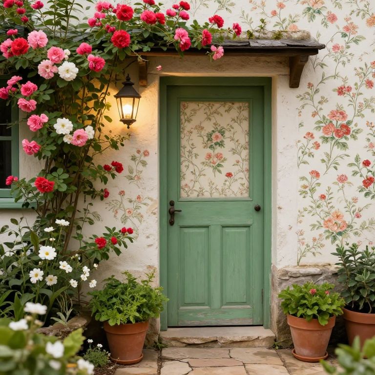 The image depicts a charming, rustic doorway set within a quaint cottage, adorned with an intricate floral wallpaper that seamlessly blends with the surrounding environment. The door, painted in a muted green with subtle wear and tear, stands slightly ajar, inviting the viewer's curiosity. To the left of the door, a lush array of flowers in shades of pink, red, and white spills over the wall, their vibrant petals contrasting beautifully with the aged stone. A small lantern hangs from the wall, casting a warm glow that enhances the cozy, romantic atmosphere. On either side of the door, terracotta pots filled with verdant plants add to the cottagecore aesthetic, their earthy tones complementing the overall scene. The floor, made of cracked stone tiles, leads up to the door, adding to the rustic charm. The composition is balanced, with the door and flowers acting as the focal points, while the lantern and plants provide a harmonious balance. The interplay of colors, textures, and shapes creates a sense of depth and dimension, making the scene feel both inviting and enchanting.