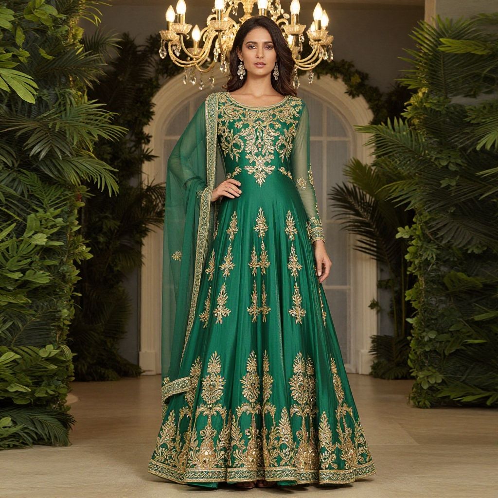 Elegant Green Gown with Gold Embroidery