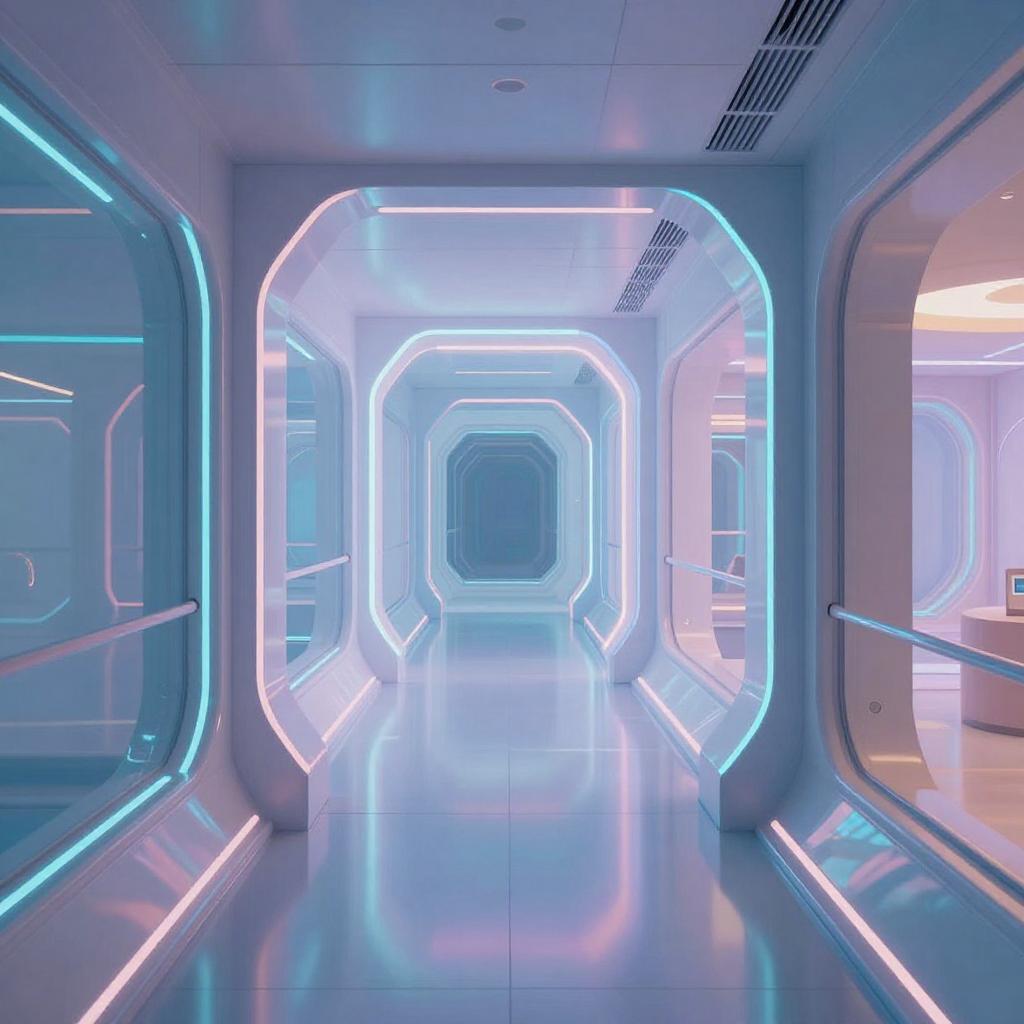 A highly detailed futuristic corridor with holographic and iridescent pastel hues in a high-tech environment. The architecture is sleek and surreal with vibrant neon colors, reflective surfaces, and atmospheric lighting creating a sci-fi, otherworldly ambiance.