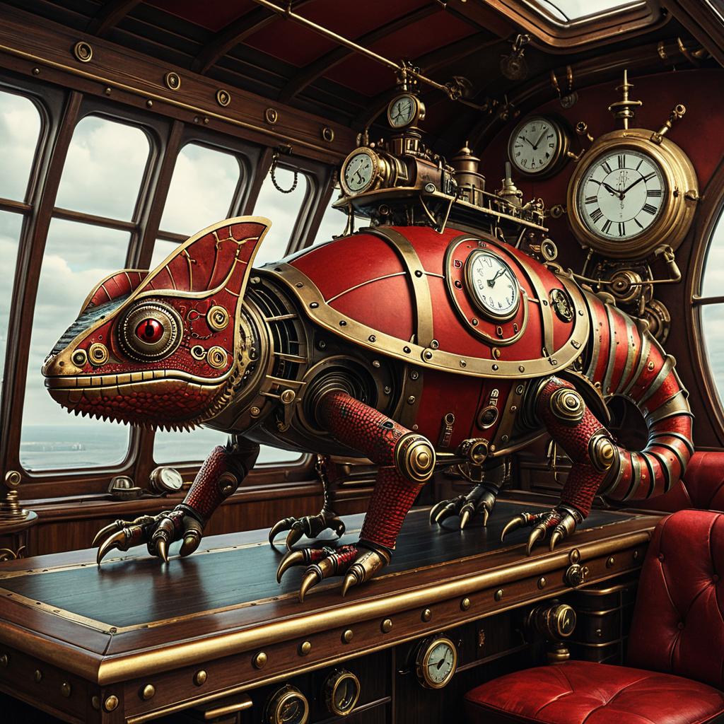 Bronze mechanized chameleon in a steampunk mystery aboard an airship rendered with trompe-lœil illusionistic detail, clockpunk accents, familiar domestic scenes and lively tableaus in the style of Evgeni Gordiets and Joe Jusko, tinted in warrior red and antique brass gold.