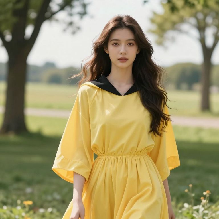 A graceful female standing in a soft sunlight, wearing a flowing yellow dress with a hood that gently falls over her shoulders, featuring a sleek black collar that contrasts beautifully with the vibrant yellow fabric. Her long, wavy hair flows slightly in the breeze, and she has gentle, expressive eyes that convey calm confidence. The scene is set in a serene countryside park with green trees and a distant horizon, adding a natural and peaceful atmosphere to the image.