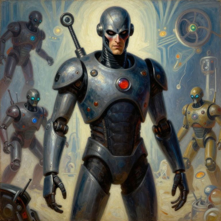 Digital painting of a muscular, armored robot with a red chest plate, standing in a futuristic, sci-fi laboratory with other robots.