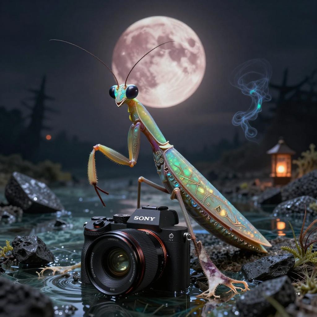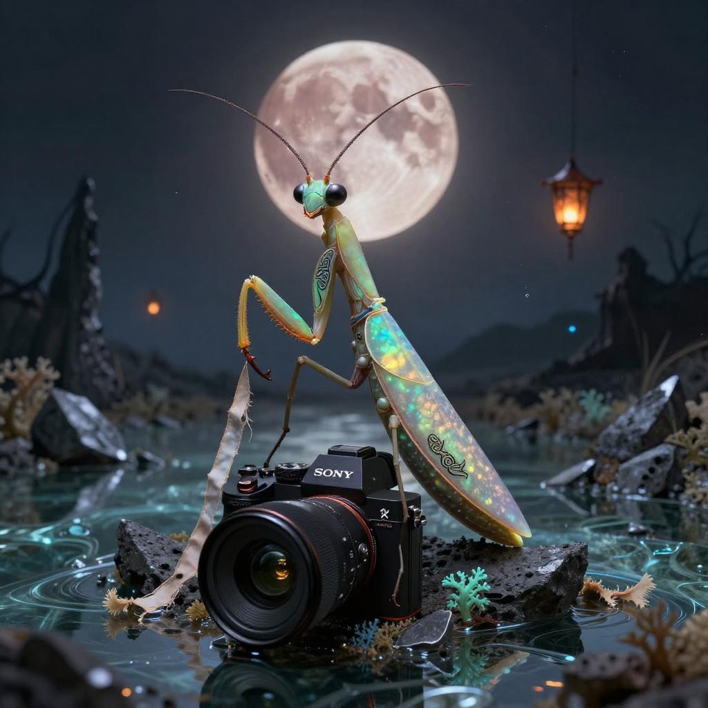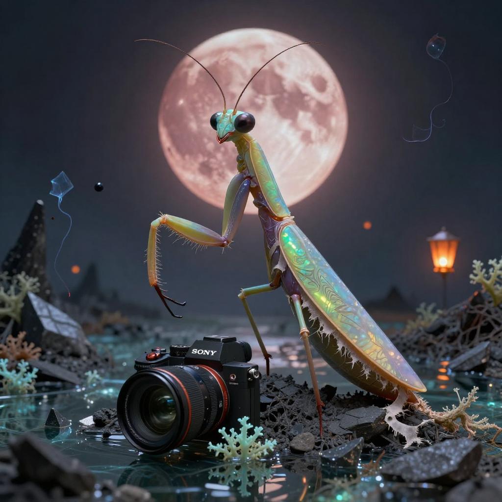 Mirror-scarred dusk-mantis oracle opaline carapace, sigil-laced foreblades, tattered ceremonial ribbons perched in obsidian bog of glassed water and meteor shards beneath a haloed bloodmoon, phosphorescent lichen and drifting spore-lanterns. Shot on Sony Alpha 1 with 135mm GM lens, (hyperdetailed), 8K HDR, dramatic lighting, cinematic atmosphere.
