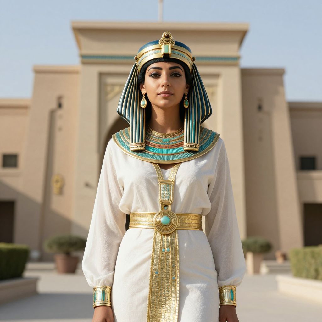 Photograph of a dark-skinned woman in ancient Egyptian attire with blue and black striped headdress, white robe, gold accents, standing in front of
