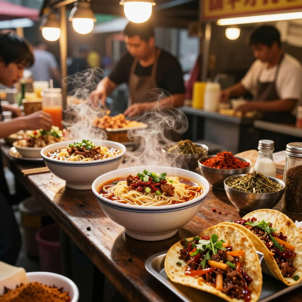 AI food image generator illustrating a vibrant street food market scene bursting with energy, featuring steaming bowls of noodles, spicy street tacos, and exotic spices, photorealistic with dynamic lighting and lively atmosphere.