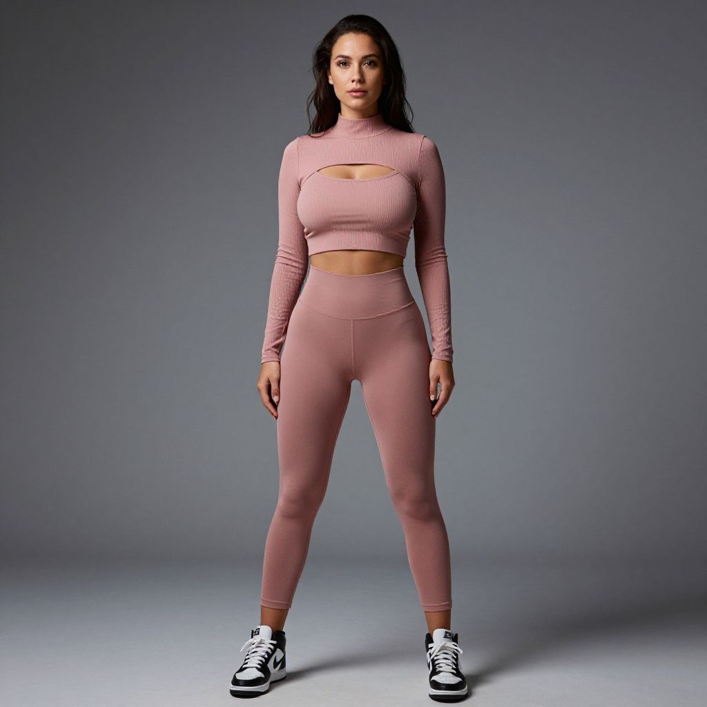 "Woman, athletic leisure, dusty rose ribbed crop top, high neck, cut-out below the bust, matching high-waisted leggings, above-the-ankle length, black and white high-top sneakers, studio background with gradient from light to dark.. Sexy. Pretty face and beаutiful eyes. Big breasts."