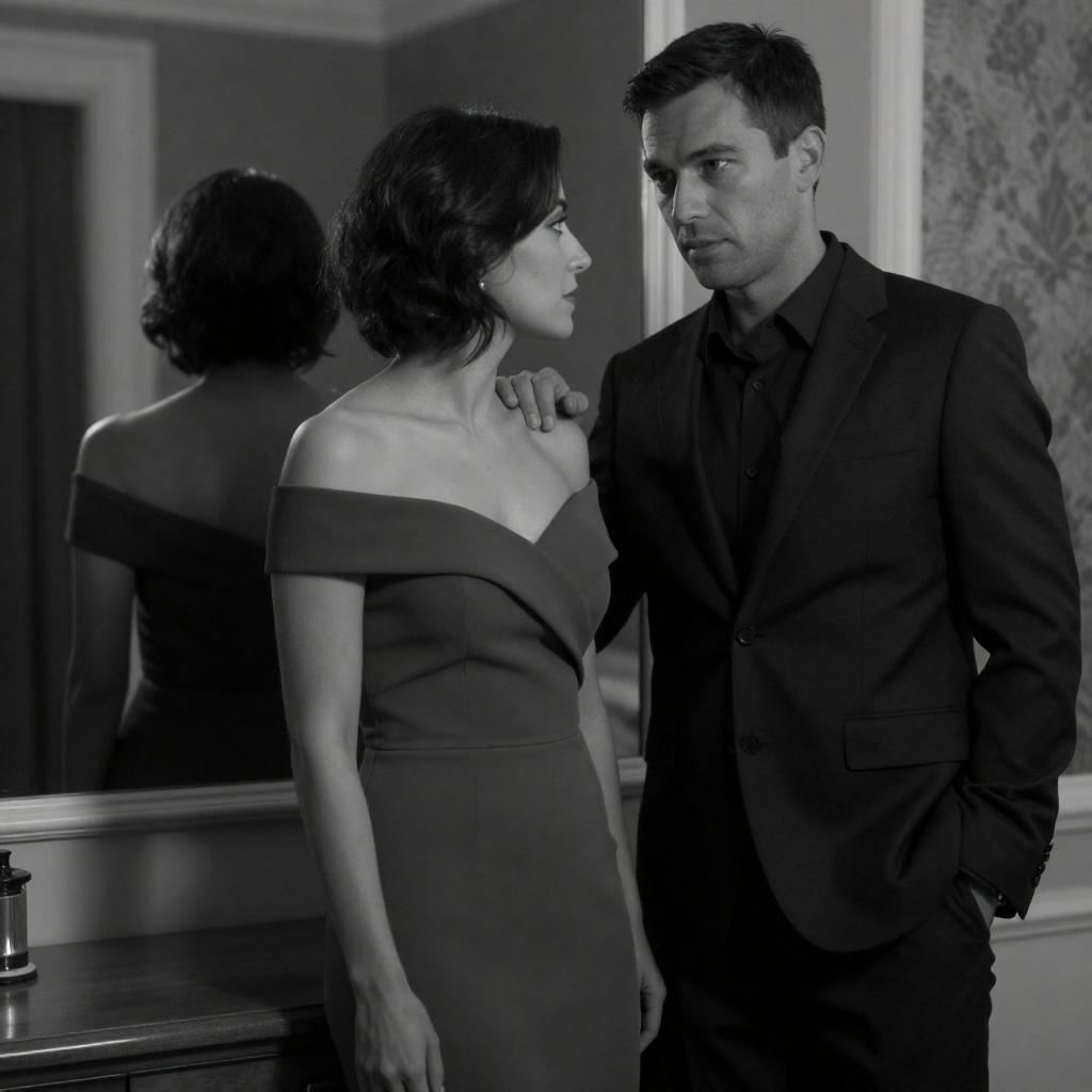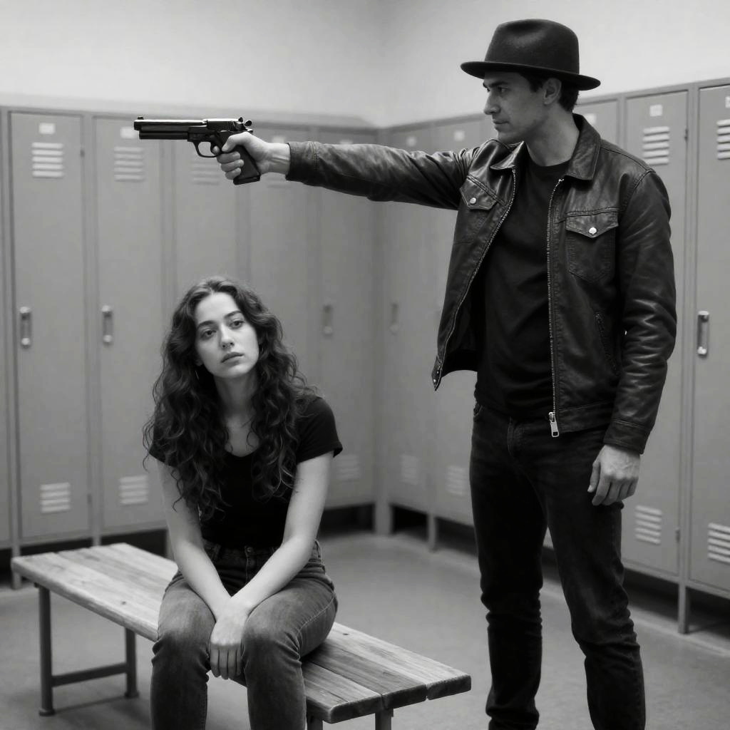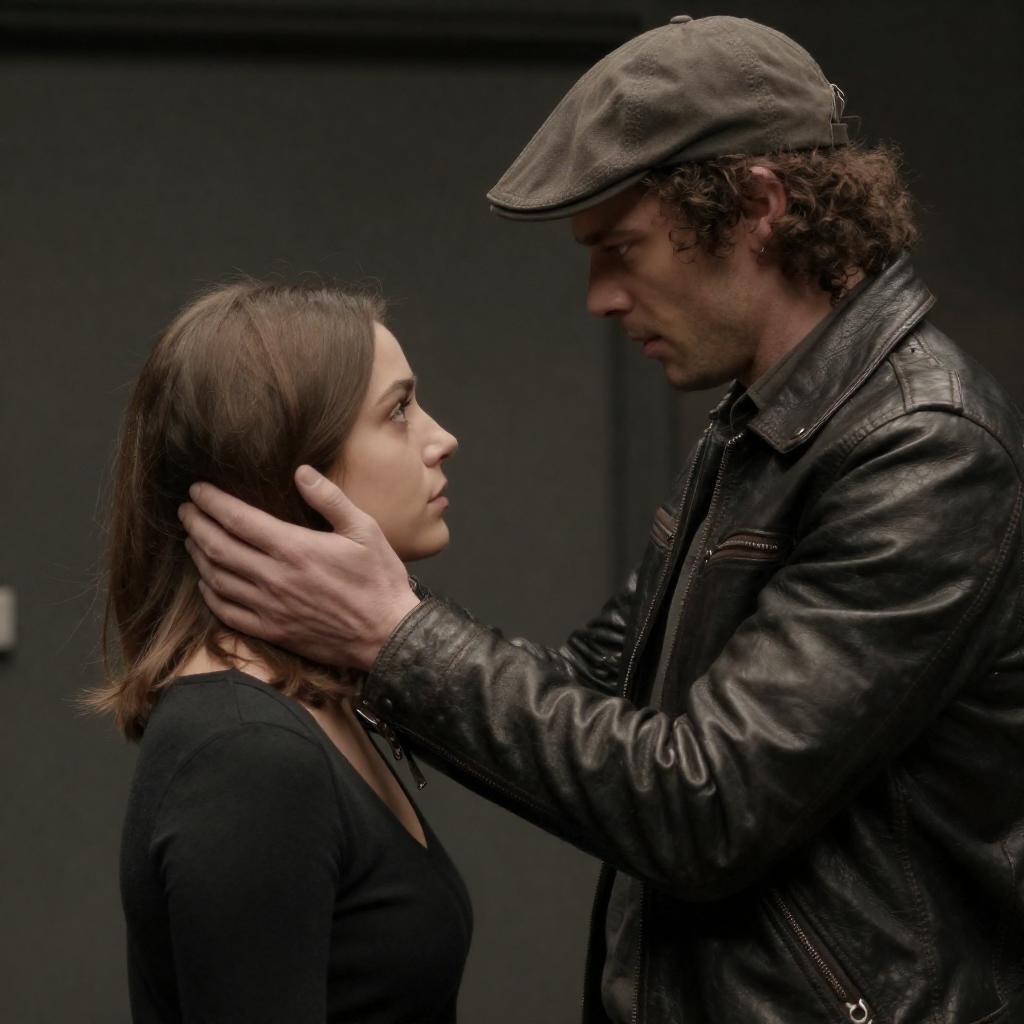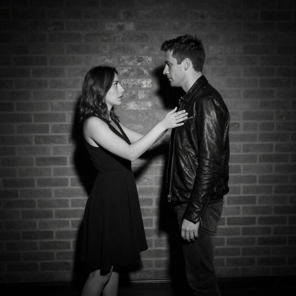 Black-and-white photograph of a young woman and man standing face to face against a brick wall. The woman with shoulder-length hair wears a sleeveless black dress and reaches out towards the man. The man wears a black leather jacket and dark jeans. The image features dramatic lighting creating deep shadows, highlighting the intense expressions and emotional tension between the couple.