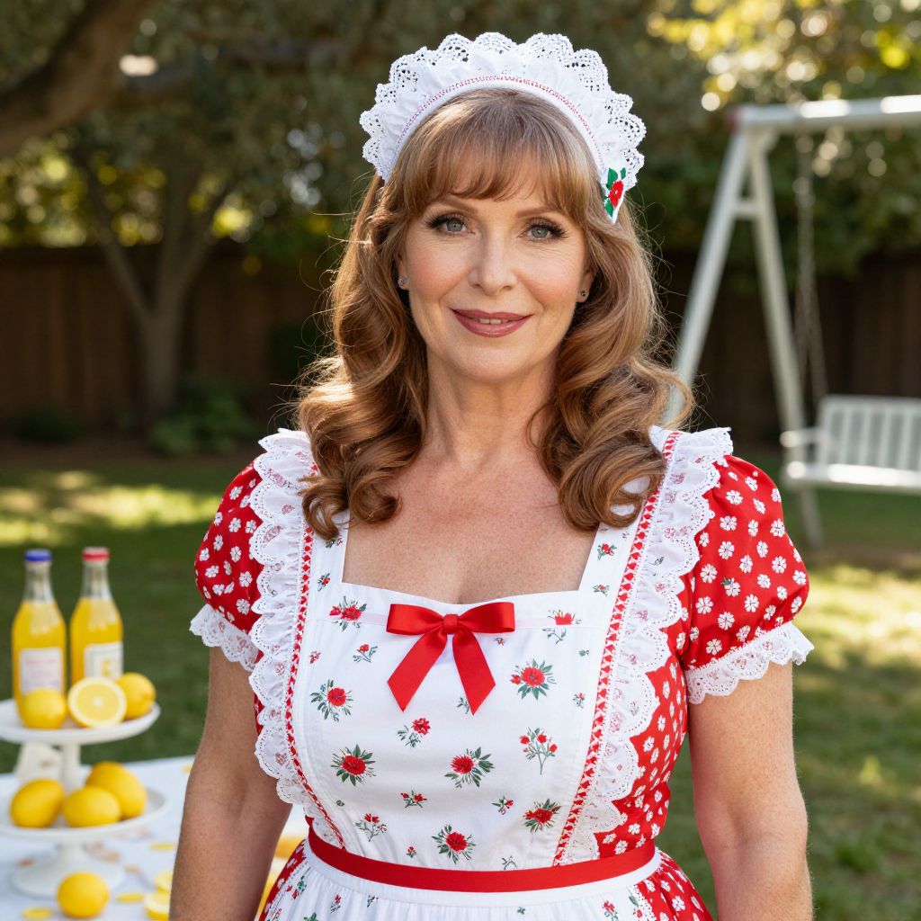 Photograph of a middle-aged woman with fair skin and brown, wavy hair adorned with a white lace headband. She wears a vintage-style red and white polka dot dress with a floral apron, red bow at the center, and white lace trim. Her makeup is subtle, with red lipstick. She stands outdoors on a sunny day in a garden, with a blurry background featuring trees and a white swing set. To her left, a white table holds two bottles of orange juice and several yellow lemons. The image has a bright, colorful, and nostalgic feel.