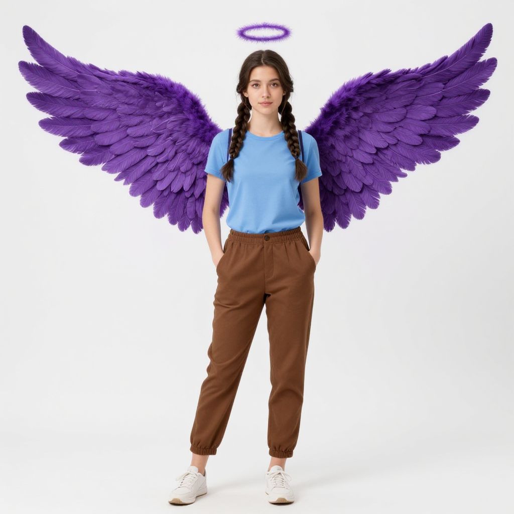 Photograph of a young woman with light brown skin and long black hair in braids, wearing a light blue t-shirt, brown pants, and white sneakers. She has large, vibrant purple feathered wings and a glowing purple halo above her head. Her hands are in her pants pockets, and she stands against a plain white background. The image has a fantasy, ethereal quality, blending realistic and whimsical elements.