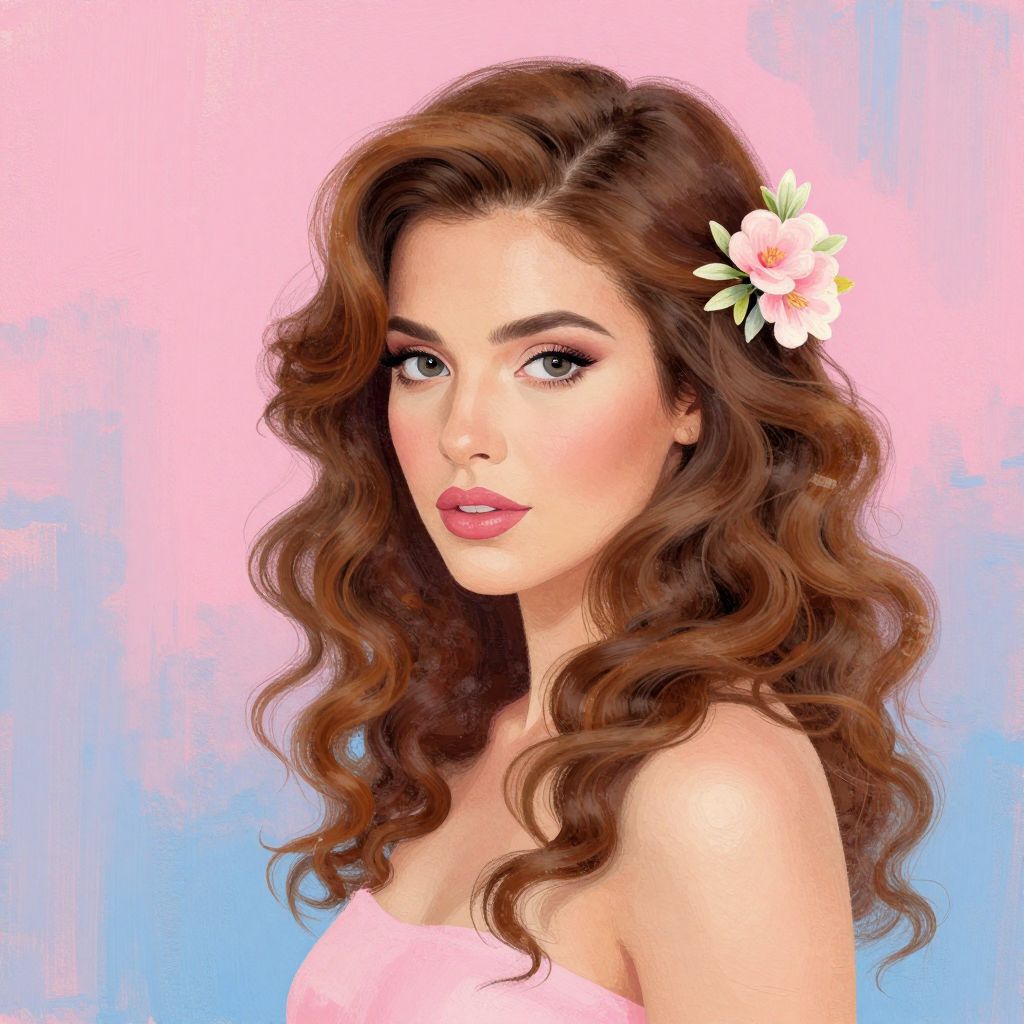 Vibrant portrait of a woman with cascading brown curls adorned with a delicate floral hair accessory, set against a textured background of soft pinks and blues, exuding a hand-painted, artistic charm.