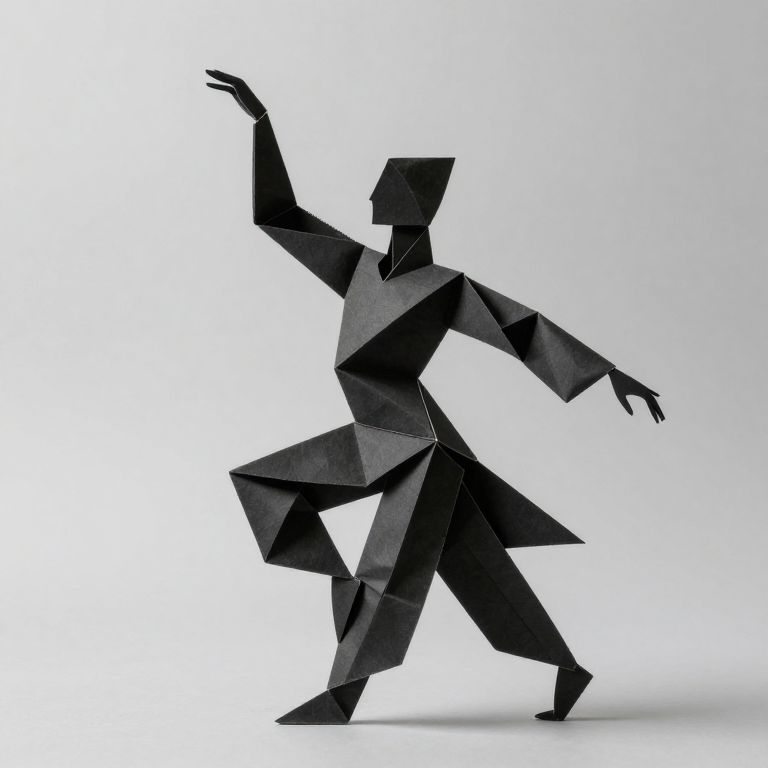 Black origami figure in dynamic pose, angular geometric shapes, raised arm, extended leg, white background, minimalist, modern art style.