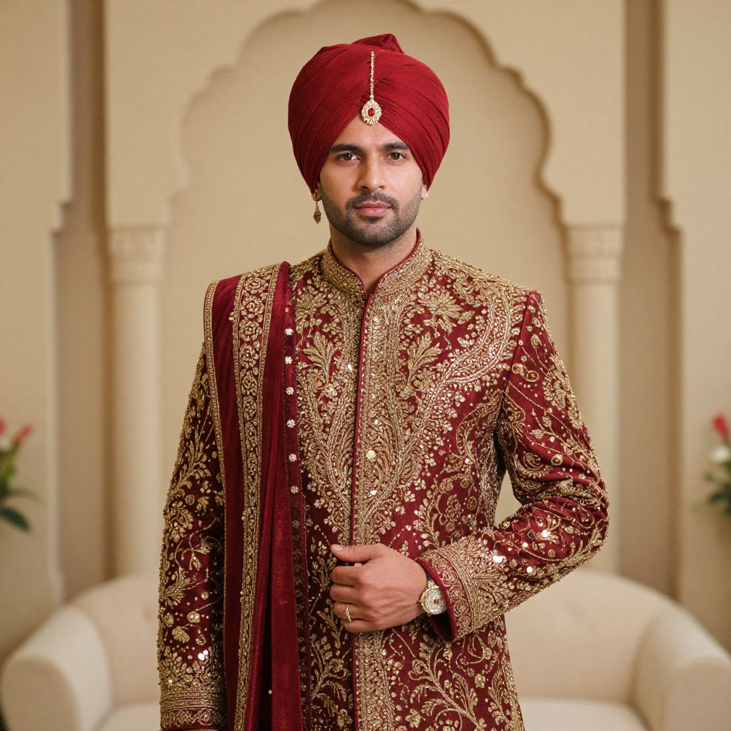 "Traditional Groom Wear, a man in a red and gold indian wedding outfit"