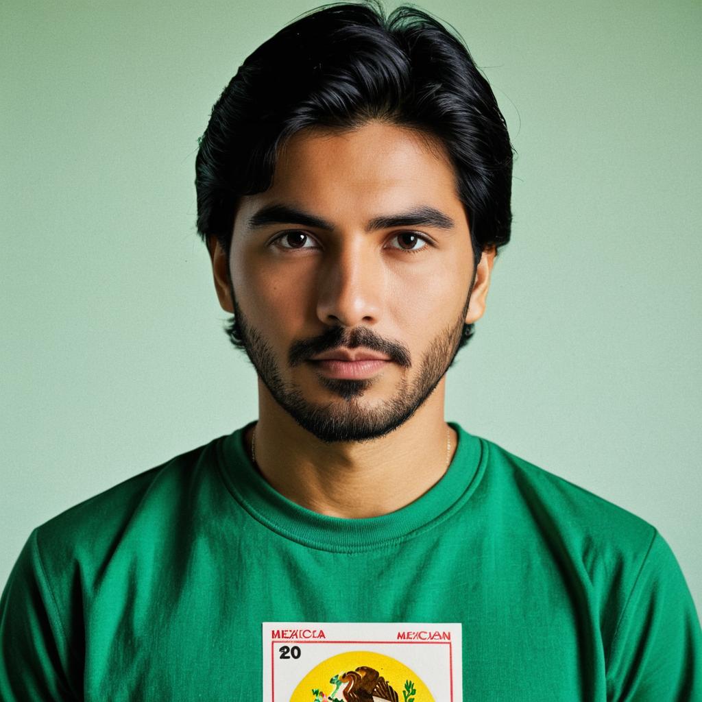 Portrait of a young Hispanic man with black hair and facial hair, wearing a green shirt featuring a Loteria Mexicana card design. The image focuses on the upper body against a plain light green background, with the man looking directly at the viewer.