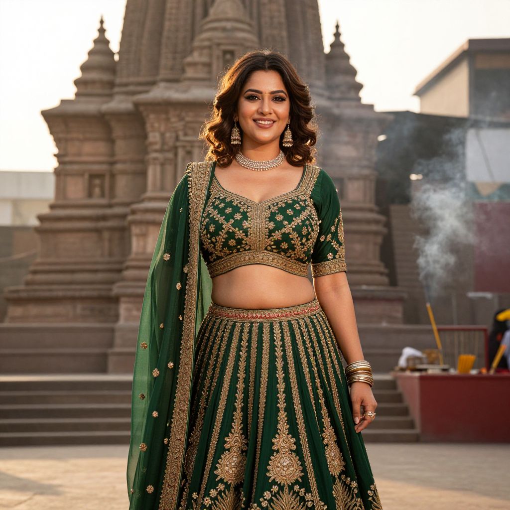 A confident Indian woman with soft brown curls and bright smile wearing a richly embroidered traditional Indian costume outfit — a deep green lehenga with gold zari work and a matching chunni — posing in front of a traditional temple in Varanasi, the setting bathed in golden hour sunlight with smoke from incense rising softly in the air.. The woman has big tits and cute face
