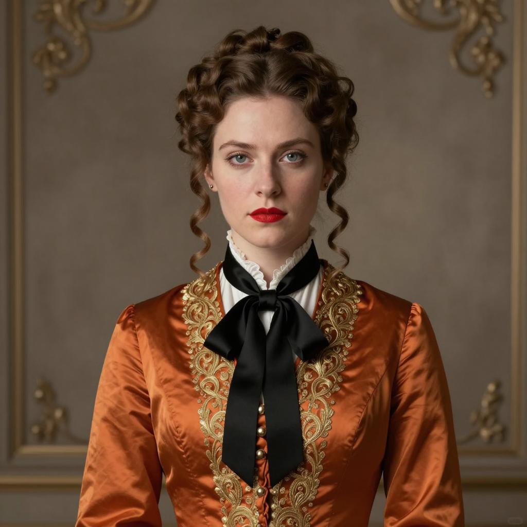 A striking portrait featuring a woman dressed in a black lace top and tight black leather pants, confidently seated on a large, realistic Bengal tiger with saddle. She is surrounded by seven men wearing formal and vintage-style suits and bow ties, some with hats, standing in a studio setting with a muted background. The image blends classic portrait styles with fantastical elements.