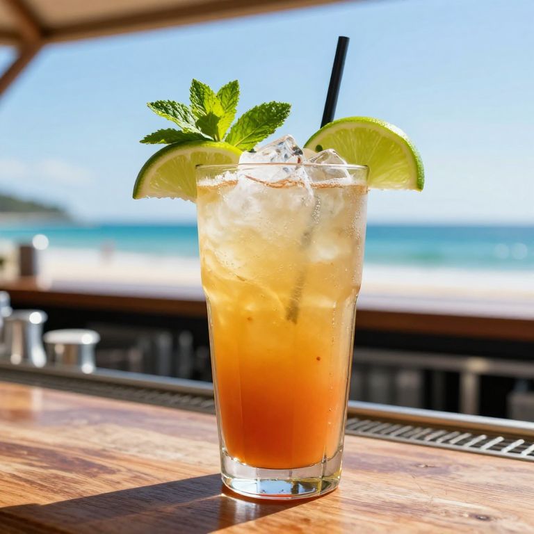 Tamarindo-themed drink on a summer beach bar counter, tall glass with tamarind juice, ice cubes, tropical garnishes like lime and mint, bright sunny sky and ocean in background, vibrant colors, refreshing and exotic vibe.