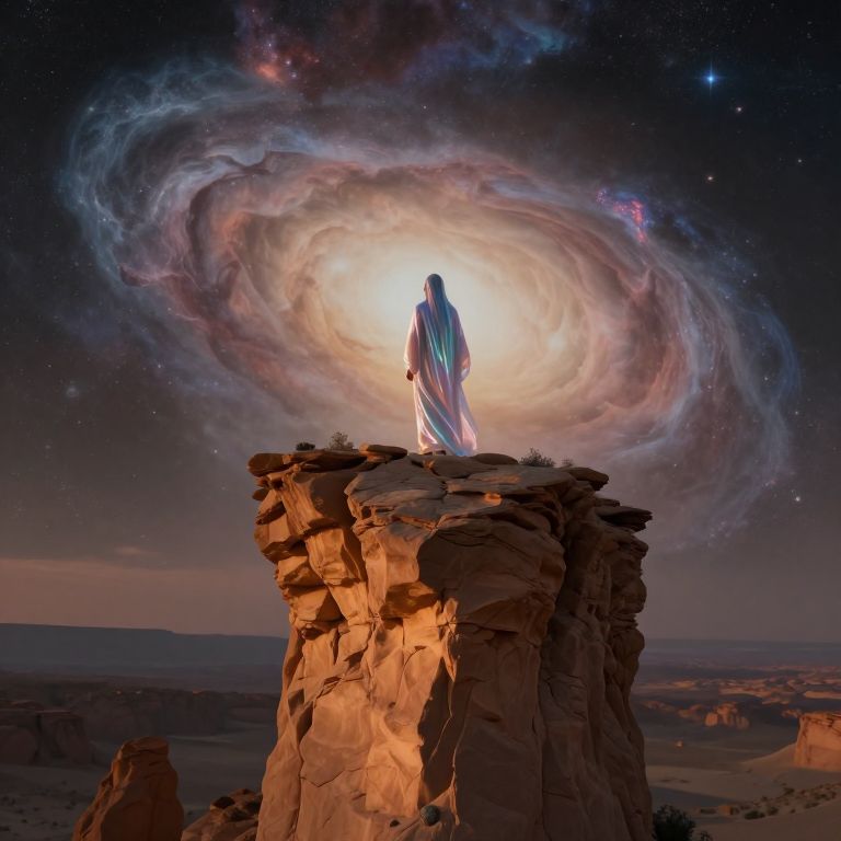 Digital artwork of a robed figure walking in a desert, with a glowing, spiral galaxy overhead, casting light on the sand.
