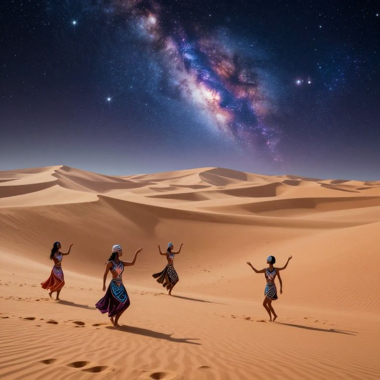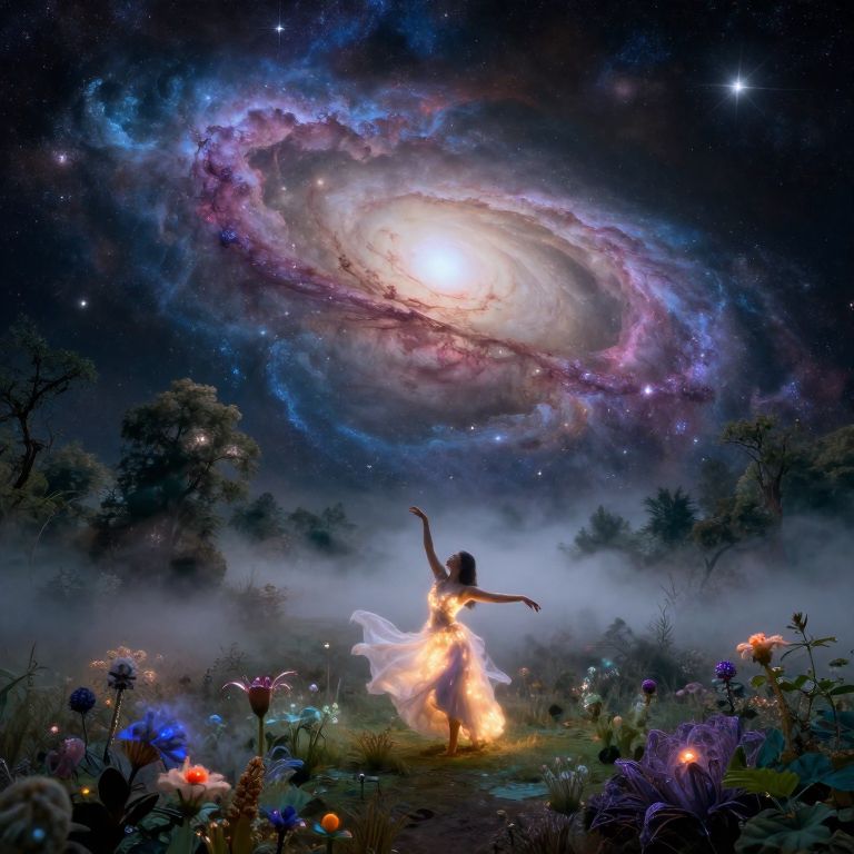 An expansive desert landscape unfolds endlessly beneath an sky teeming with swirling galaxies, reminiscent of surrealistic masterpieces. An enigmatic figure draped in flowing garments, their face hidden by a delicate veil, traverses the undulating dunes from an 'otherworldly eye' perspective, underscoring the vastness and strangeness of the setting. Soft, luminescent lights flicker around the figure, creating intricate patterns that imbue the scene with a sense of intrigue and awe, seamlessly merging reality with fantasy in a harmonious blend of high realism and dreamlike artistry.