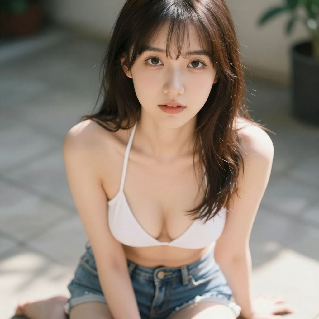 1girl, bikini, short shorts, perfect face, perfect eyes, perfect lighting, looking at viewer (masterpiece, best quality, high quality, highres:1.2), detailed, extremely detailed