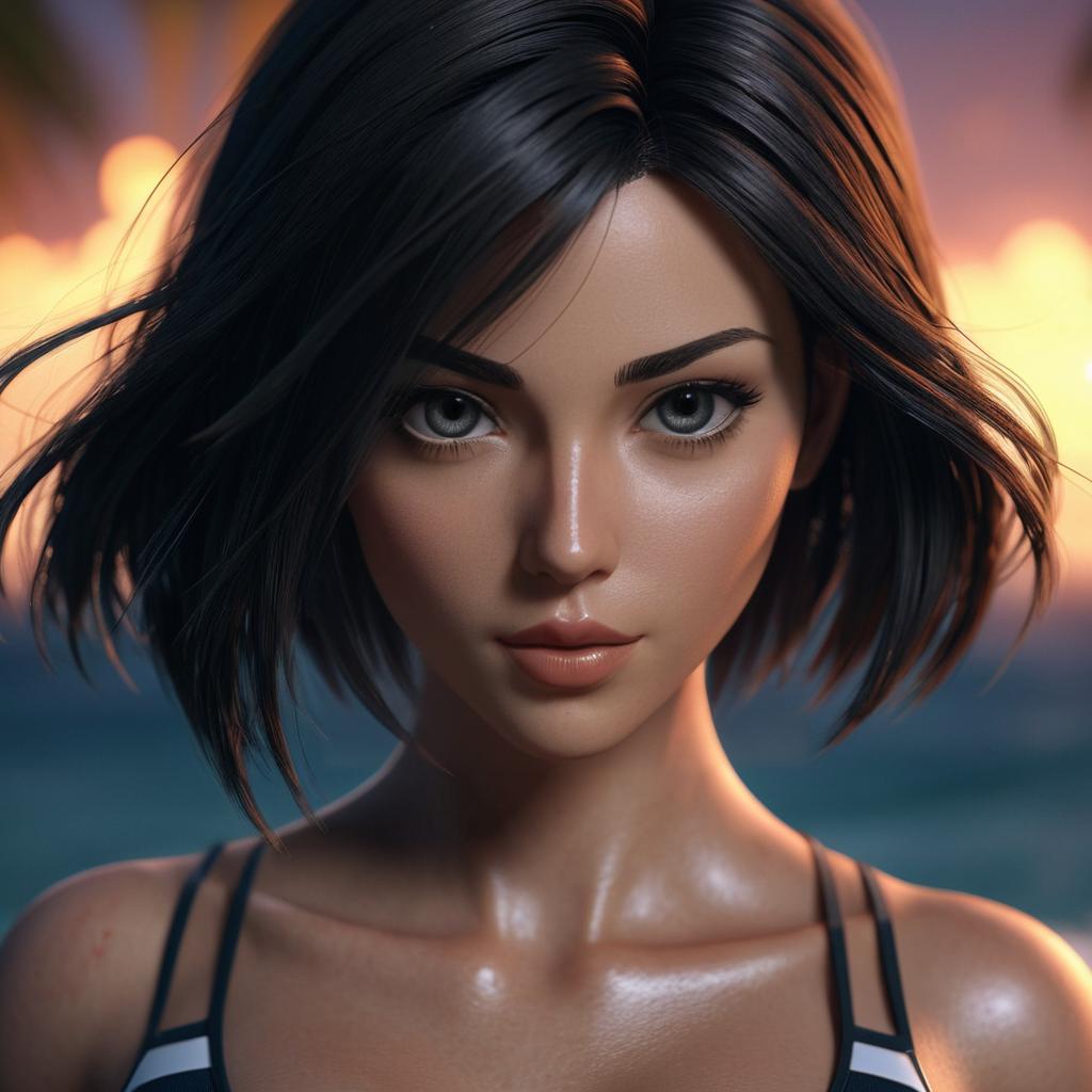 Digital portrait of a stunning, dark-haired woman with glossy skin, intense green eyes, and a focused expression, set against a sunset backdrop.