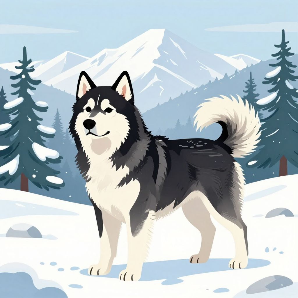 Vector illustration of an Alaskan Malamute dog standing on snow-covered ground with a mountainous winter landscape in the background. The dog has a thick fur coat with black, white, and gray markings and a fluffy curled tail. Snow-covered pine trees and mountain peaks create a cold, serene atmosphere.