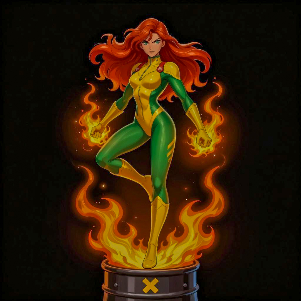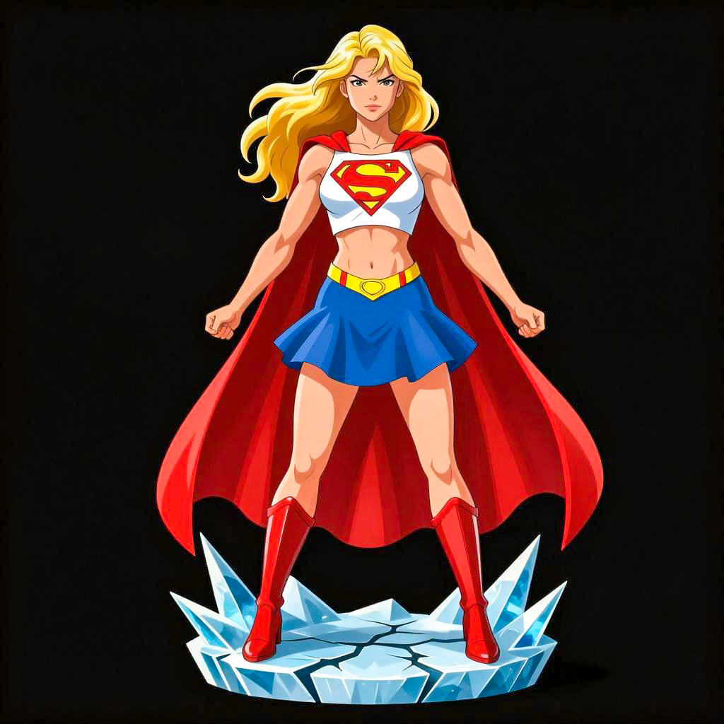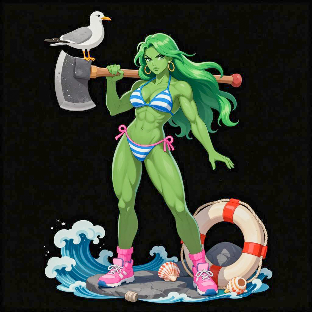 Green-skinned muscular woman with long green hair, striped blue and white bikini, pink panties, pink socks, and pink sneakers. She holds a large, weathered axe over her right shoulder. A white seagull perches on the axe head. She stands on a rocky base with waves, a red and white lifebuoy, seashells, and rope. Her left arm is extended outward. She has a determined expression. The background is solid black. Digital illustration.