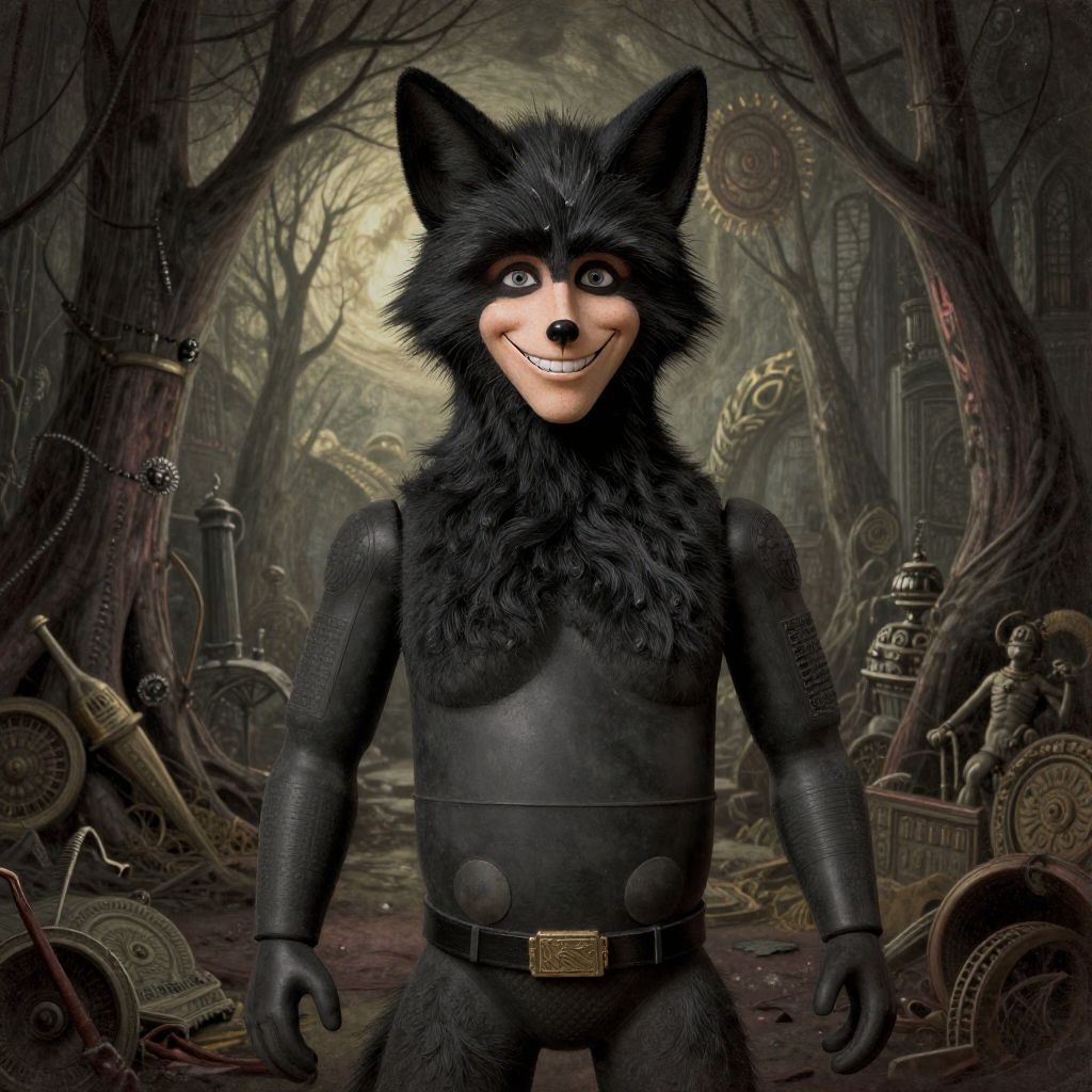 Digital artwork of a humanoid black-furred wolf with large ears and a wide, smiling face, standing in a dark, foggy forest. The wolf wears a black leather bodysuit with metallic plates and a belt with a golden buckle. Surrounding the wolf are various steampunk gadgets and machinery, including gears, clockwork devices, and pipes. The background features twisted, leafless trees and a dim, eerie light filtering through the fog. The overall style is dark, fantasy-themed with a blend of steampunk elements. The wolf's fur is detailed, with a texture that contrasts against the smooth leather of the bodysuit.