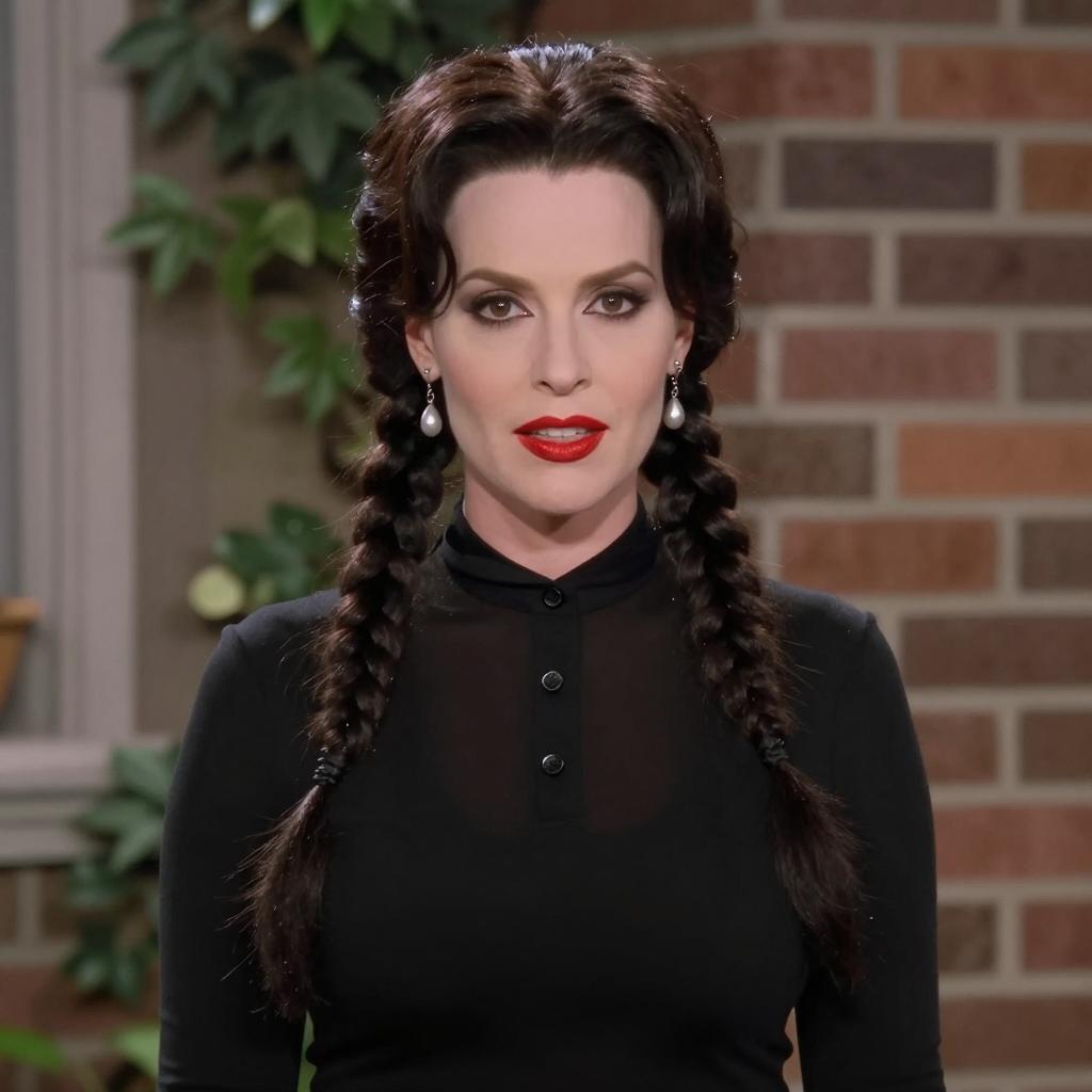 Addams adult morticia, photograph of a woman with pale skin, dark brown hair in braids, wearing a black long-sleeve top with a high neckline and small button, red lipstick, silver drop earrings, standing in front of a brick wall with greenery in the background, natural light, portrait, realistic style