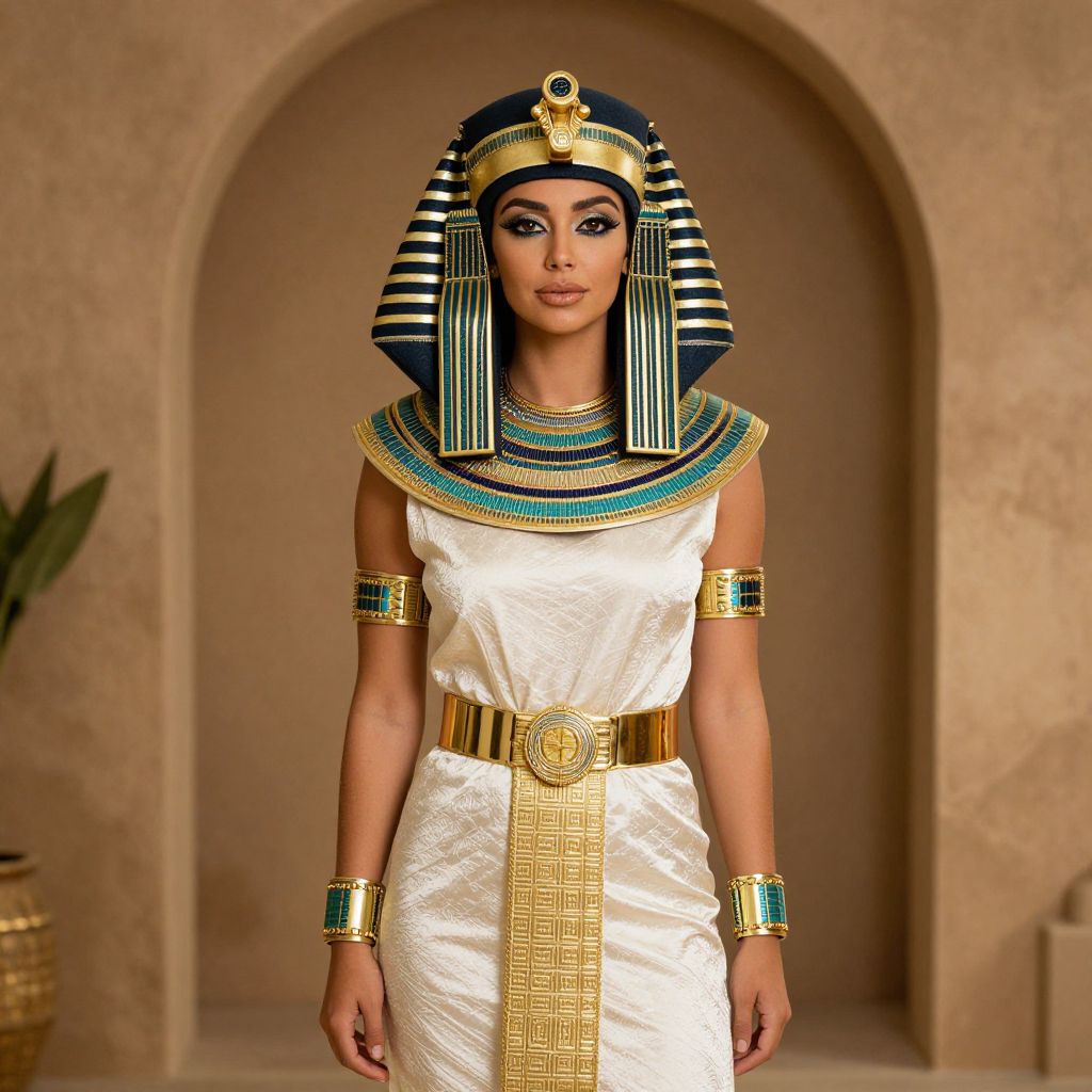 Photograph of a woman dressed as an ancient Egyptian queen. She has a light brown skin tone, dark eyes, and wears a striped black and gold nemes headdress. Her white, sleeveless linen dress is adorned with gold and blue circular and striped jewelry on her neck, arms, and waist. A gold belt with a central circular design cinches her waist. The background features a beige, arch-shaped wall with a potted plant on the left. The overall style is regal and historically inspired, with a focus on vibrant, traditional Egyptian attire.